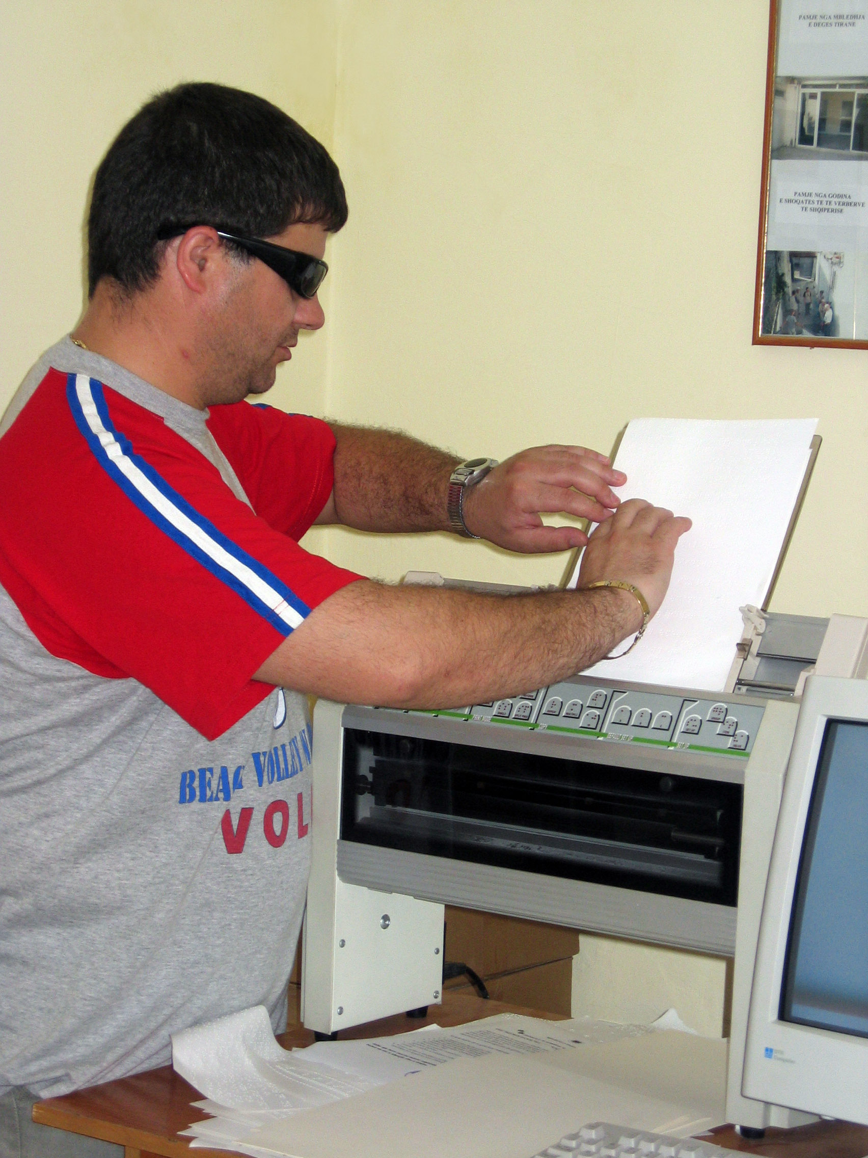 A blind person reads election material in Braille, which is available for the first time in Albania through an OSCE Presence project. It enables secret voting for the blind in parliamentary elections on 3 July 2005.