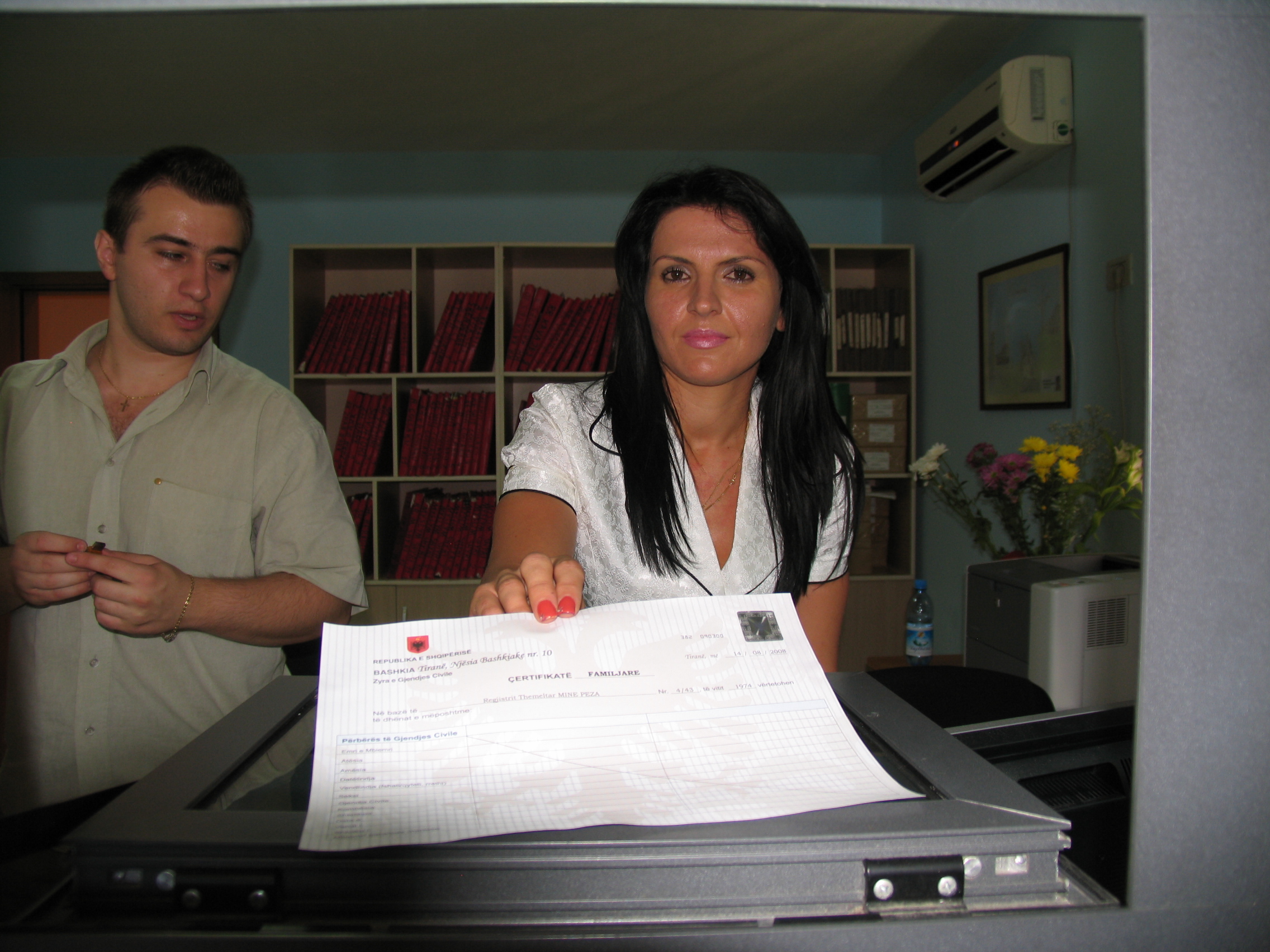 A Civil Status Office employee in Tirana issues a printed civil status certificate, 14 August 2008. Albania now has a computerized civil registration database thanks to a project implemented by the Interior Ministry with the support of the OSCE Presence.