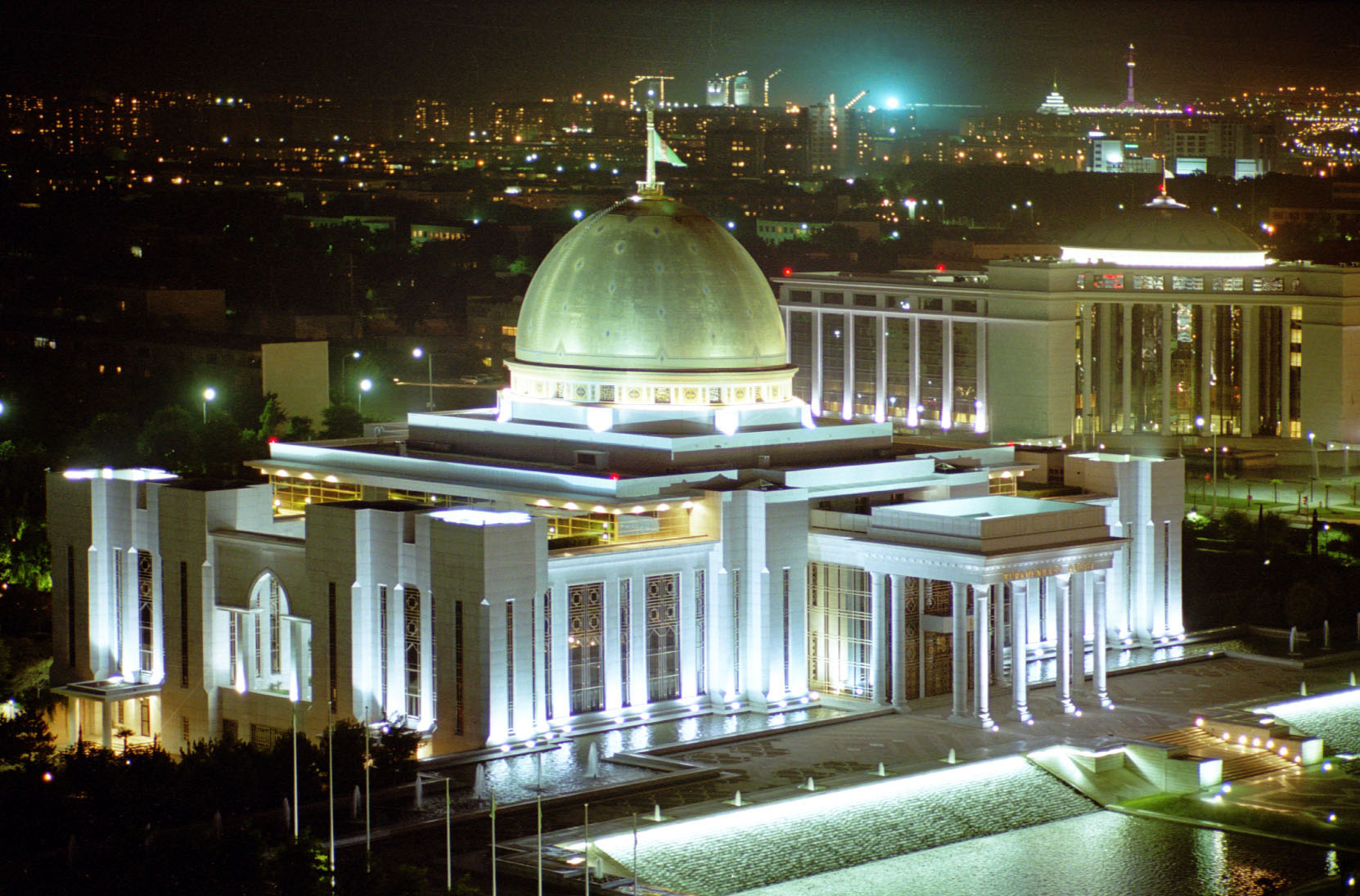 Night view of the presidential palace from the Arch of Neutrality, Ashgabat, Turkmenistan, June 2001.