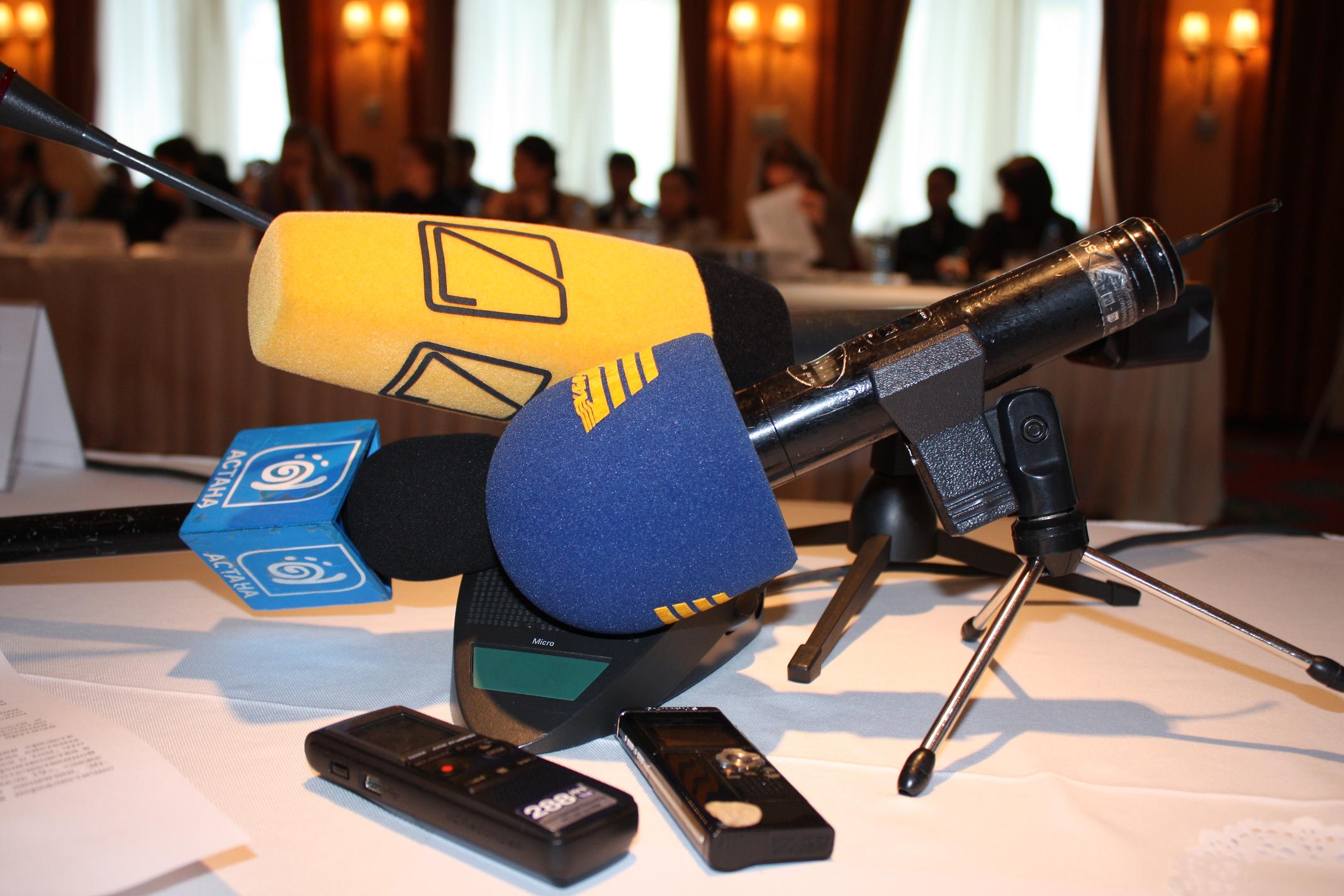 Microphones from media outlets covering a discussion on draft broadcasting legislation organized by the OSCE Centre in Astana, the Office of the OSCE Representative on Freedom of the Media and Kazakhstan’s Ministry of Communication and Information, Astana, 26 April 2011.