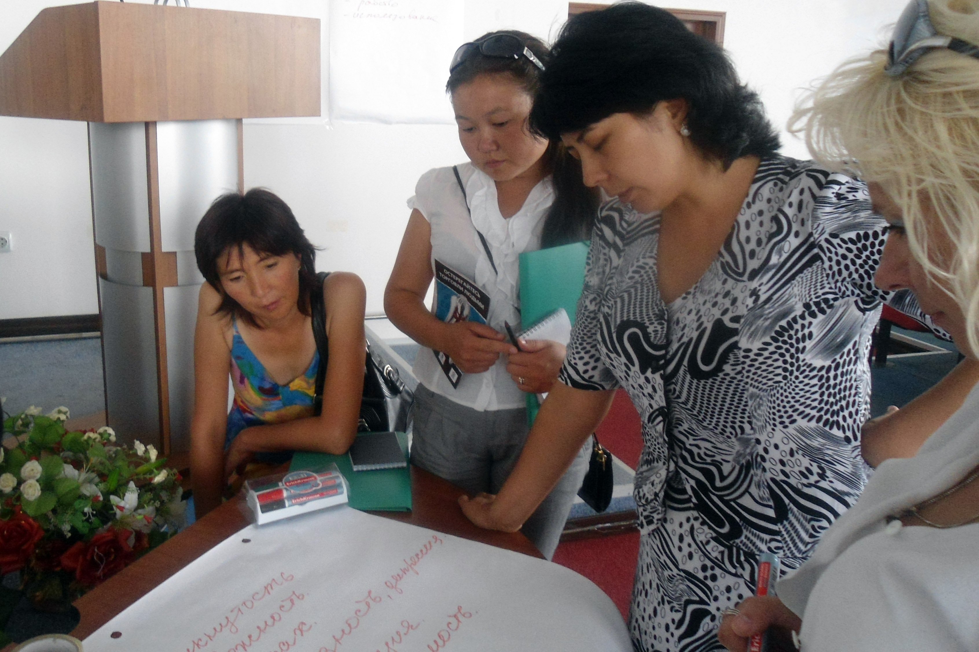 Participants in an OSCE seminar brainstorm about human trafficking prevention strategies, Taldykorgan, 18 August 2011.