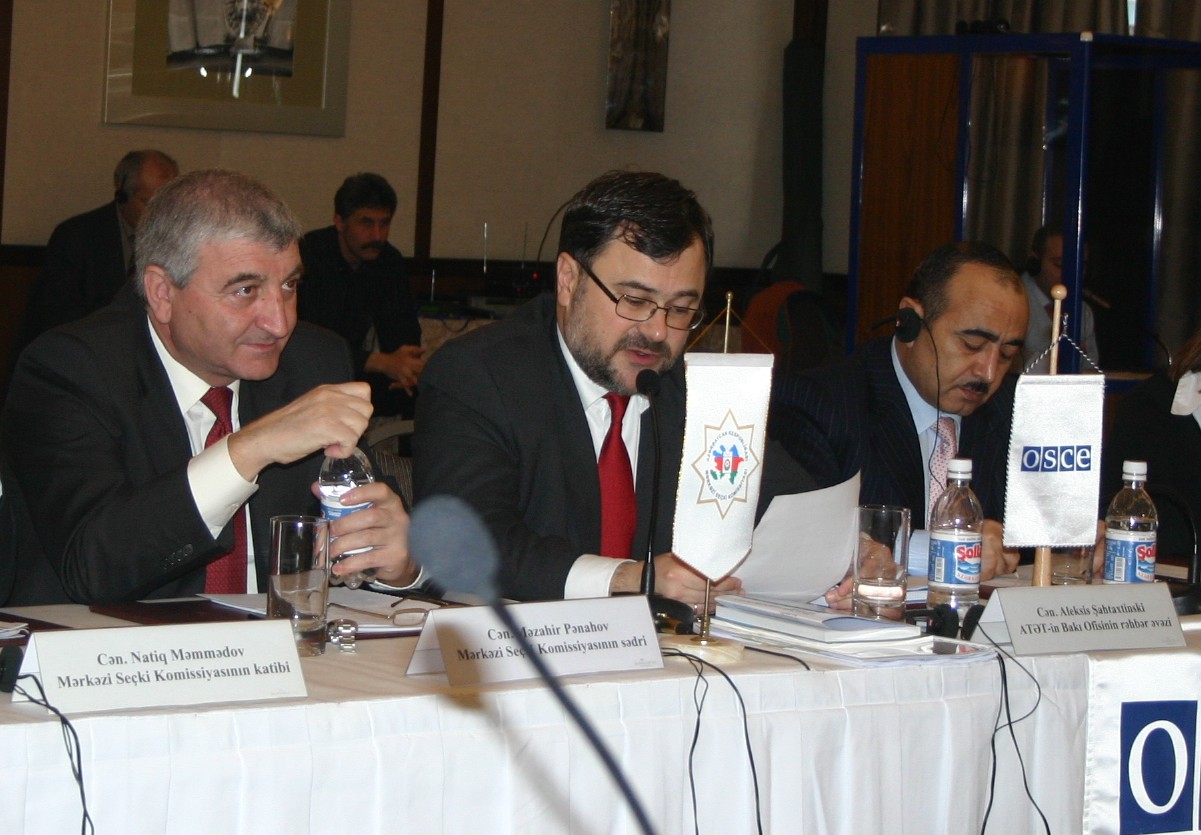 Alexis Chahtahtinsky (c), Acting Head of the OSCE Office in Baku, addresses a meeting on non-interference in the electoral process, Baku, 3 March 2009. Also pictured are CEC Chairman Mazahir Panahov (l), and Ali Hasanov (r) of the President's office.