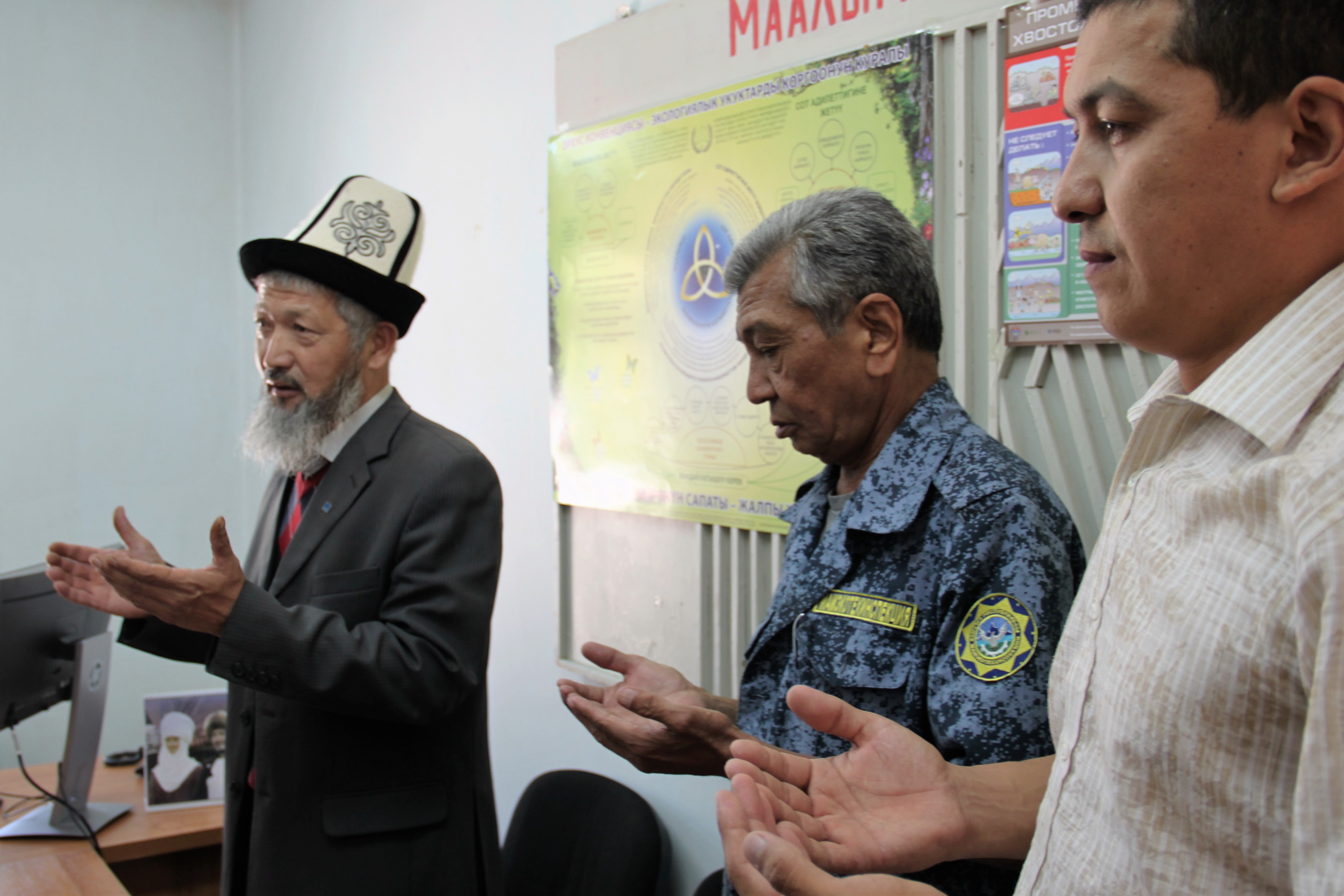 Ibragimov Khasambai (l), chairman of the local aksakal' council, with Alibekov Abdrasul (c), representative of the regional department of the State Inspection on Environmental and Technical Safety, and Matnazarov Jenishbek (r), head of unit at the Ministry of Emergency Situations, inaugurate the opening of the Public Environmental Information Centres with a prayer in Mailuu-Suu, Kyrgyzstan. 14 September 2016.