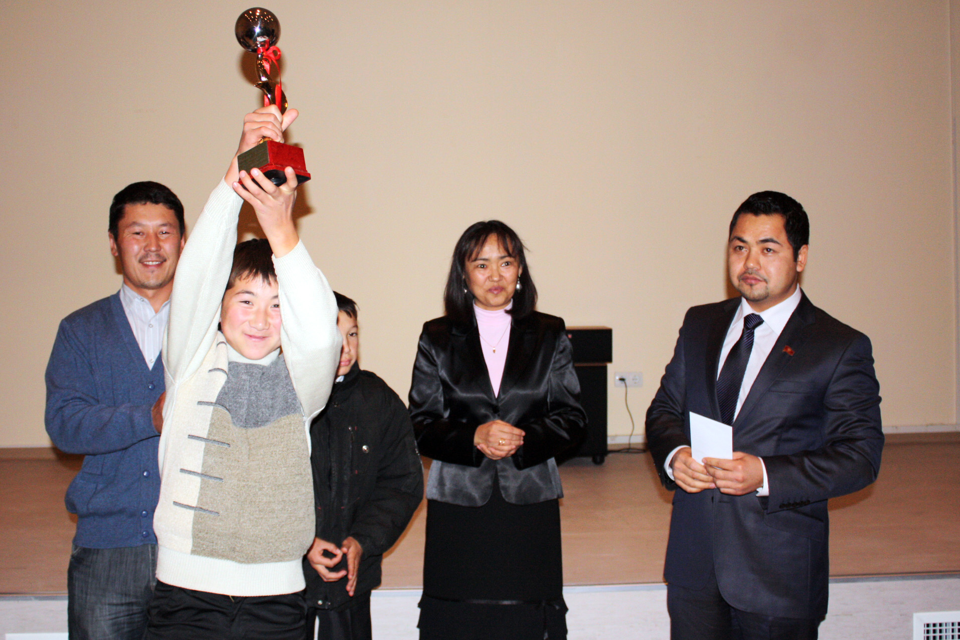 Young actor Toktosun uulu Murat, from the winning film "A letter to the President" receives an award from Member of Parliament Daniar Terbishaliev (r), Bishkek, 10 December 2010.