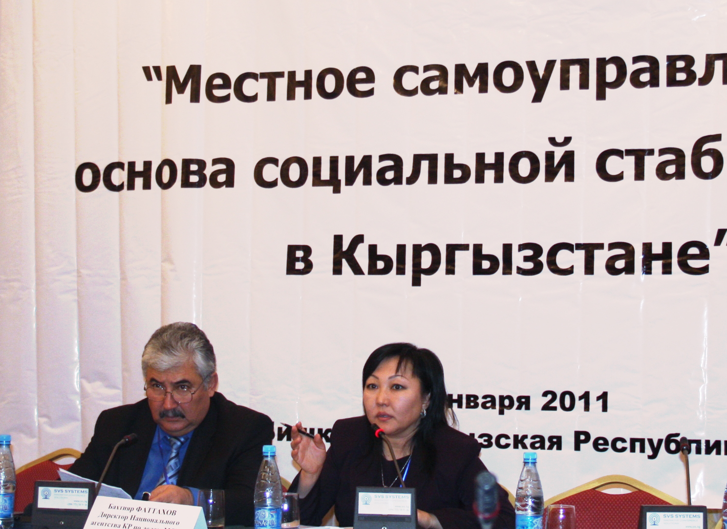 Bakhtiyar Fattakhov (l), Director of the National Agency for Local Self-Governance Bodies and Ulara Narusbaeva, Stats-Secretary of the National Agency for Local Self-Governance Bodies, making concluding remarks at the conference on local self-governance, Bishkek, 28 January, 2011.