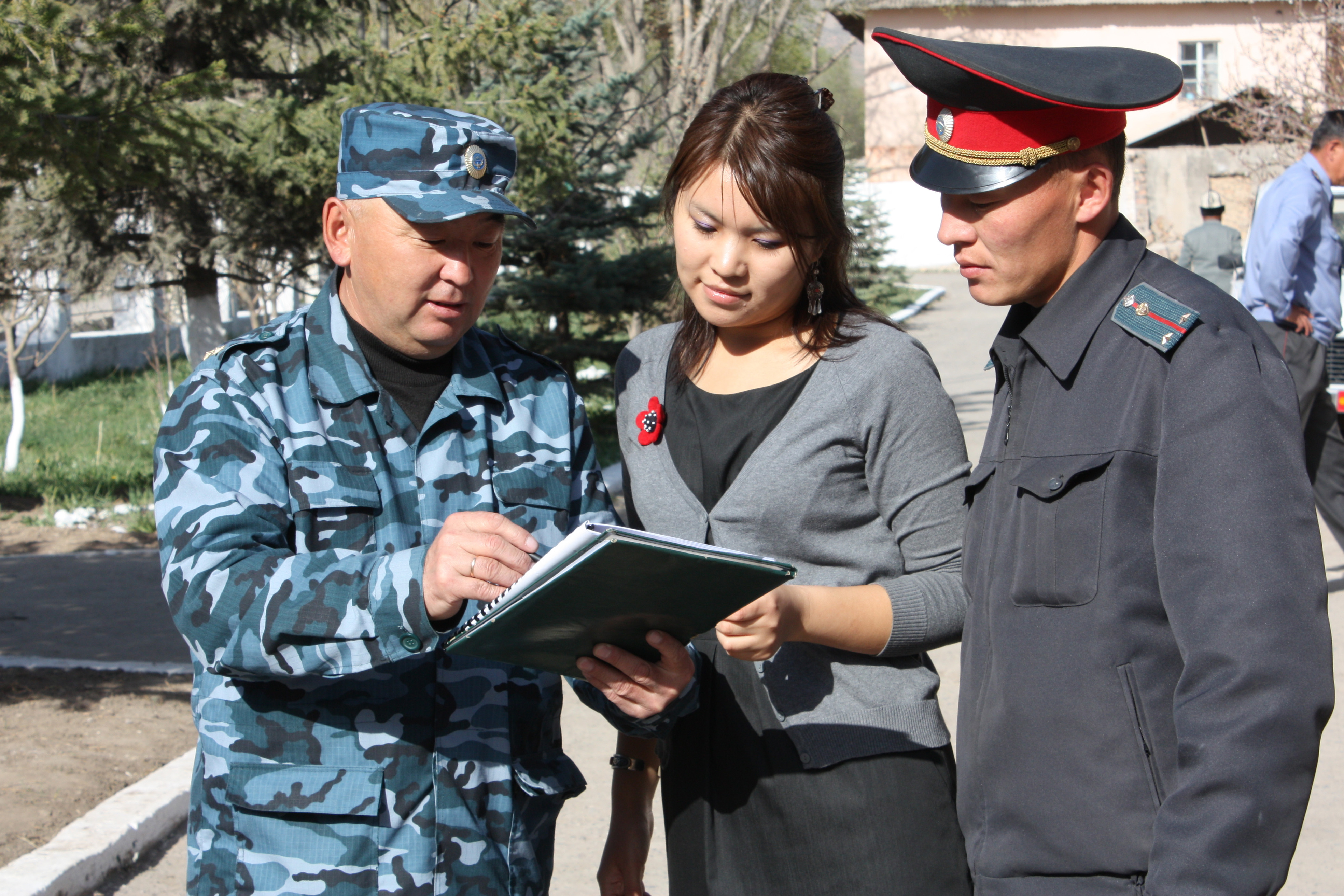 L-r: Zarylbek Akymbaev, Senior Neighbourhood Inspector from Naryn, Jibek Uzubekova, OSCE Centre in Bishkek Programme Assistant, and Kurmanbek Musukeev, Juvenile Delinquency Inspector from Naryn, during a training session on community policing, Naryn, 27 April 2011.