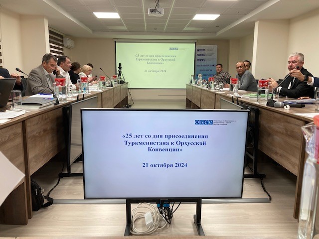 Participants discuss the role of the Aarhus Centre in promoting the Aarhus Convention during an OSCE-organized conference dedicated to the 25th anniversary of Turkmenistan's accession to the Aarhus Convention, Ashgabat, 21 October 2024, OSCE