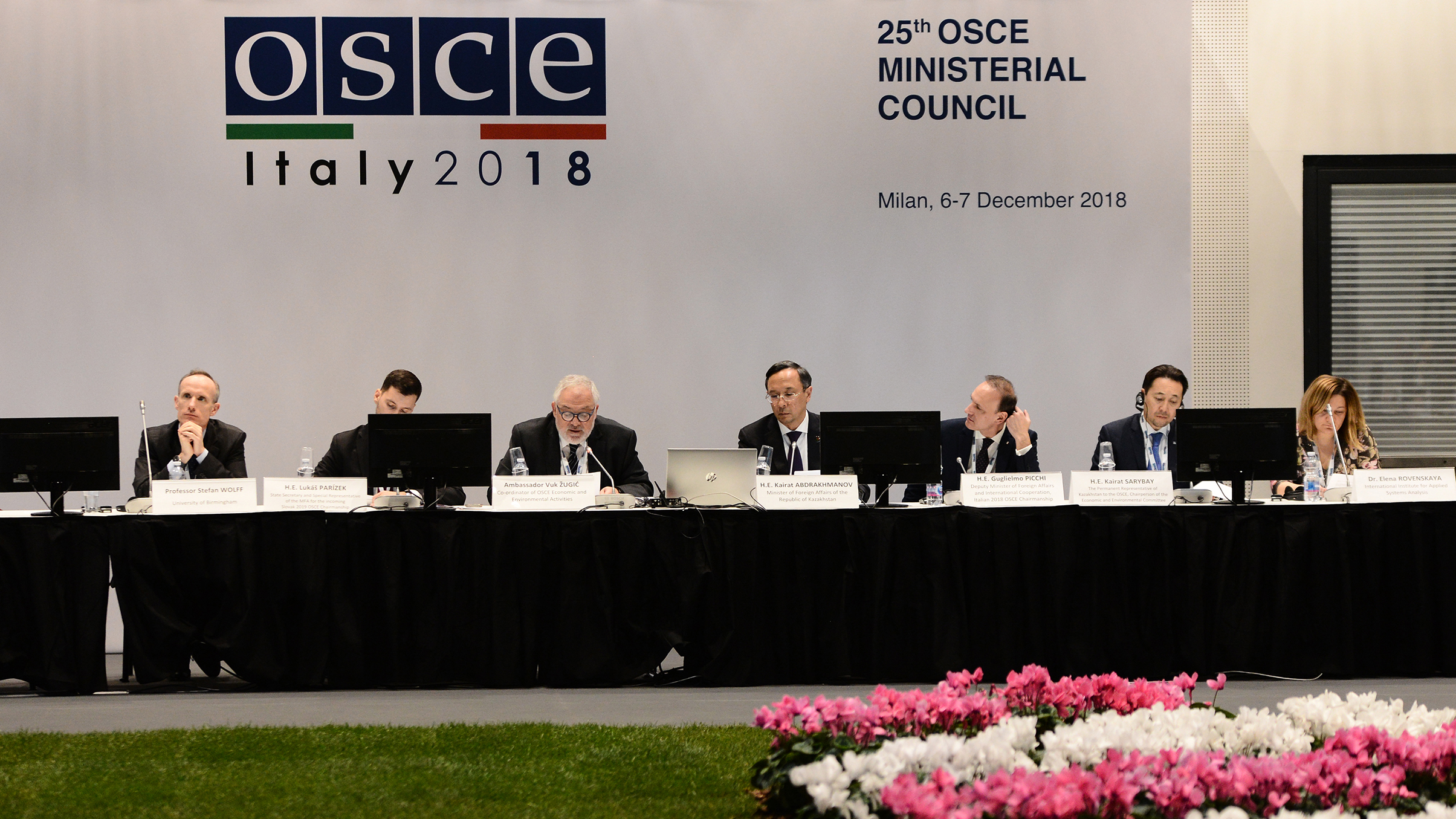 Side event on promoting economic connectivity in the OSCE area held during the 25th OSCE Ministerial Council in Milan, 6 December 2018. (L-r) Stefan Wolff, University of Birmingham; Lukas Parizek, Special Representative for the OSCE Chairmanship and State Secretary of the Ministry of Foreign and European Affairs of Slovakia; Vuk Zugic, Co-ordinator of OSCE Economic and Environmental Activities; Kairat Abdrakhmanov, Foreign Minister of Kazakhstan; Guglielmo Picchi, Deputy Minister of Foreign Affairs of Italy; Kairat Sarybay, Permanent Representative of Kazakhstan to the OSCE; Elena Rovenskaya, International Institute for Advanced Systems Analysis (OSCE/Pamela Rovaris)