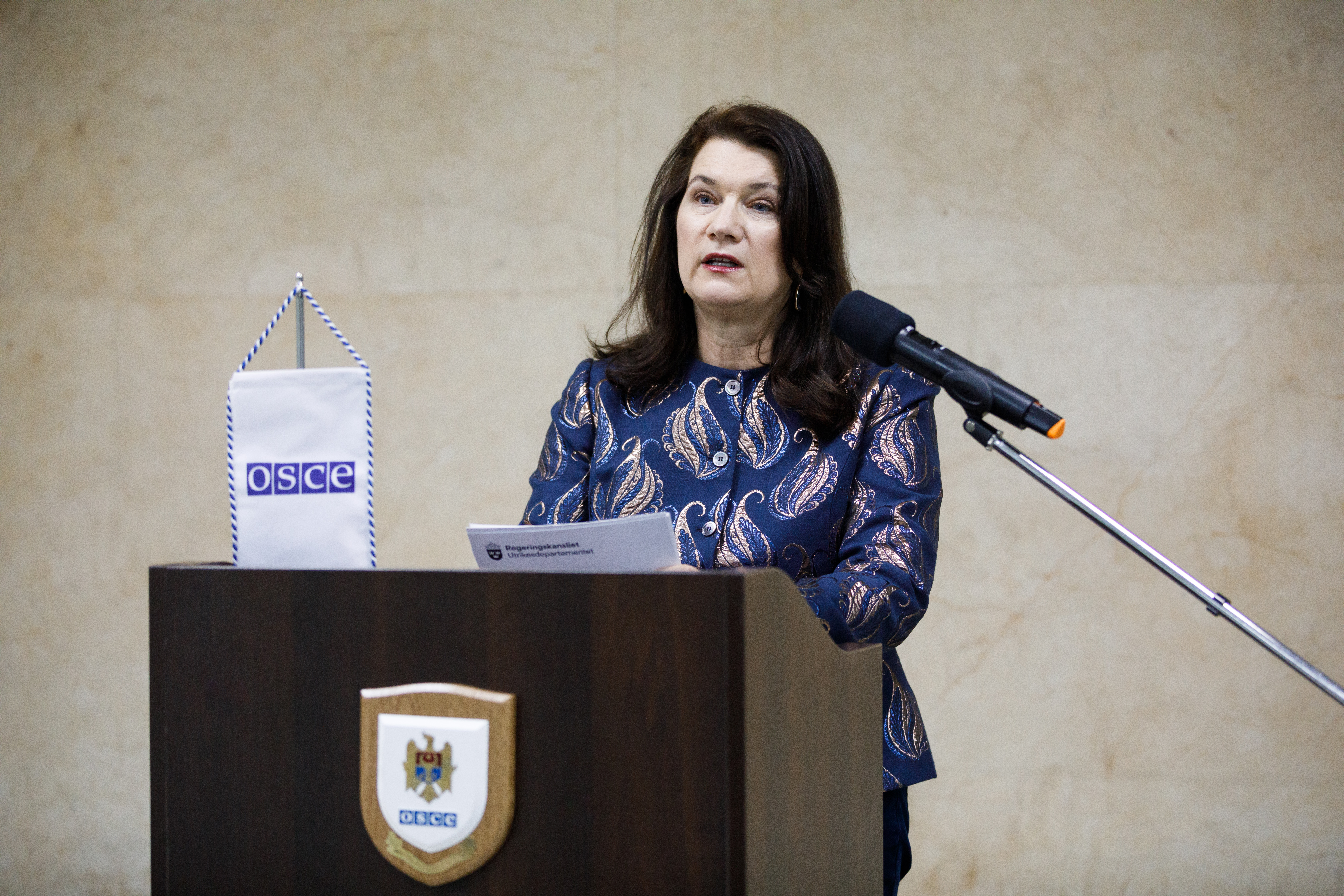 Ann Linde, OSCE Chairperson-in-Office and Swedish Minister for Foreign Affairs, briefing the press on the outcomes of her visit to the Republic of Moldova, 17 February, Chisinau.