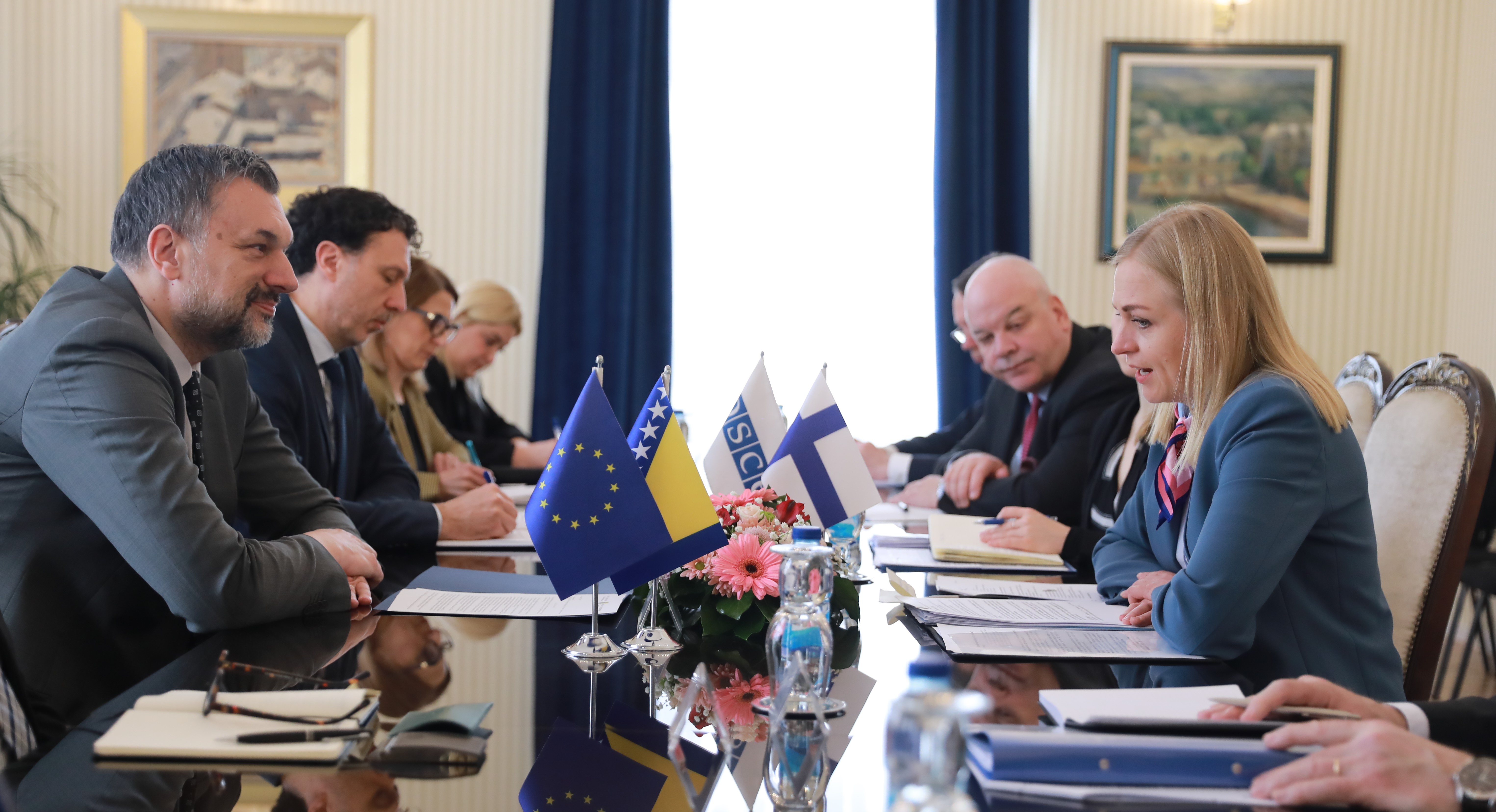 OSCE Chair-in-Office Finnish Foreign Minister Elina Valtonen meeting with Minister of Foreign Affairs of Bosnia and Herzegovina Elmedin Konaković during her visit to Bosnia and Herzegovina, 18 March 2025