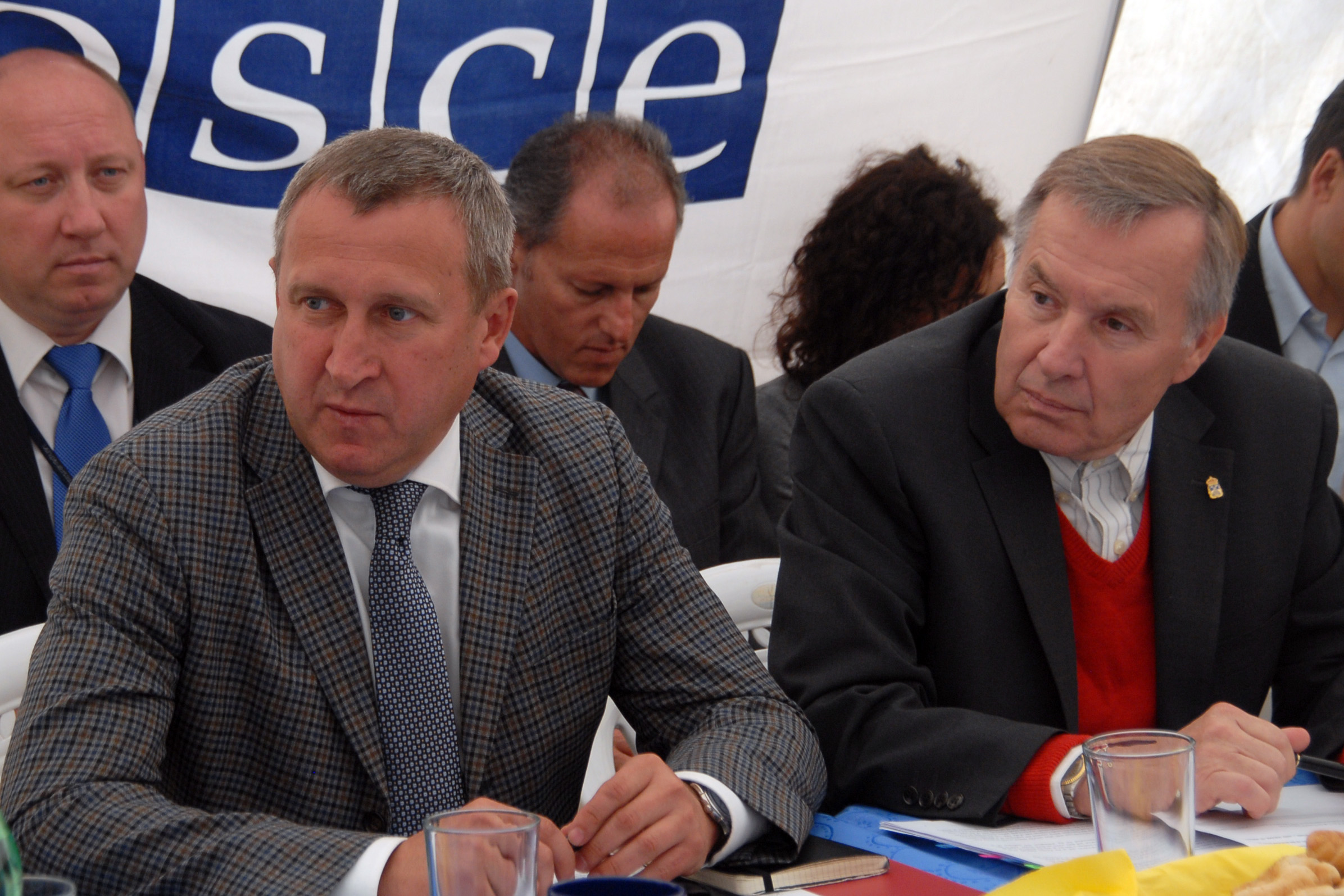 Andrii Deshchytsia (l), the Special Representative of the OSCE Chairperson-in-Office for Conflicts, alongside Gerard A. Fischer, the interim Head of the EU Monitoring Mission in Georgia, at the 37th meeting under the Incident Prevention and Response Mechanism, Ergneti, 16 September 2013.