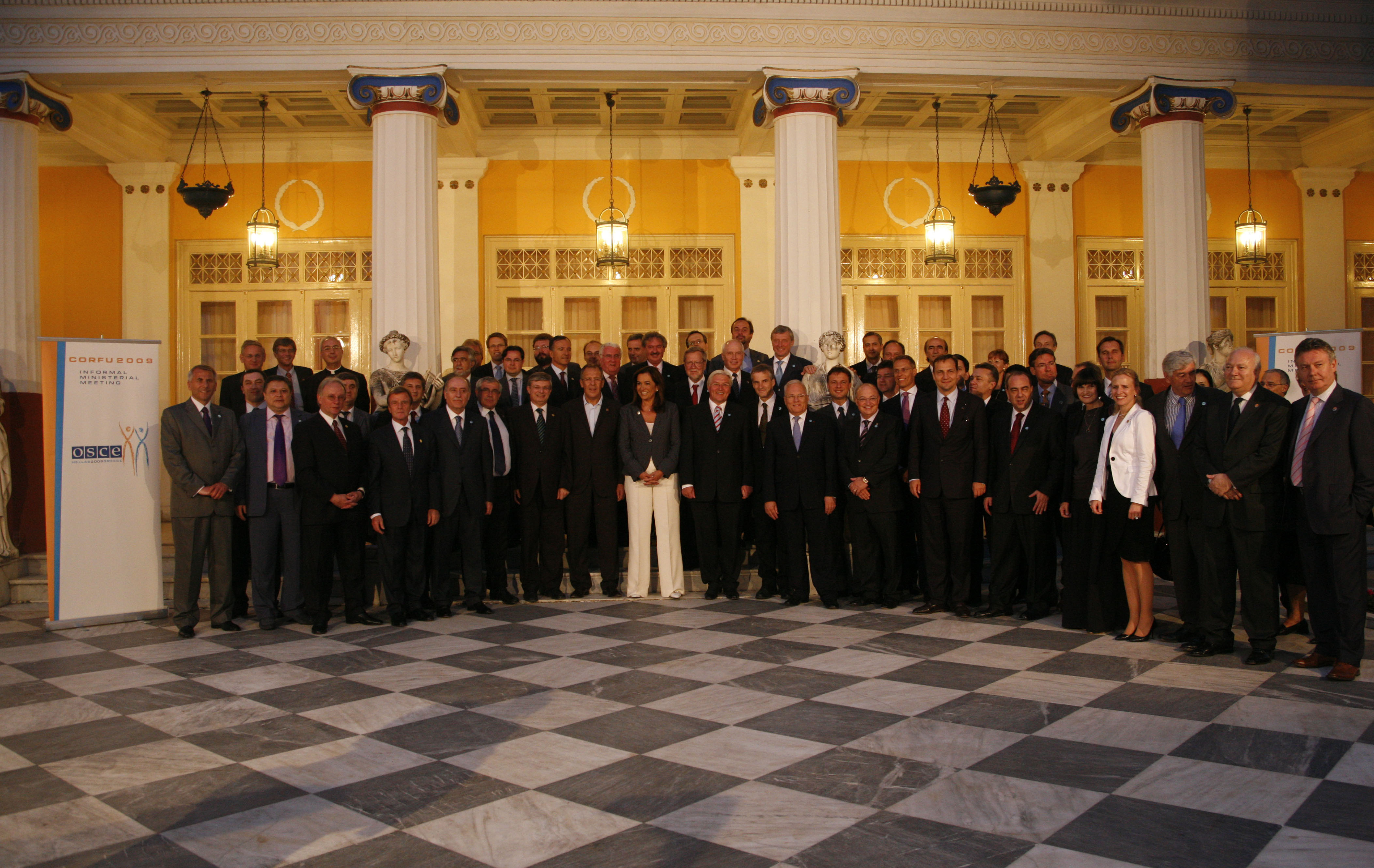 Ministers pose for a family photo at the Achillion Palace at the opening of the informal meeting of OSCE foreign ministers, Corfu, 27 June 2009.