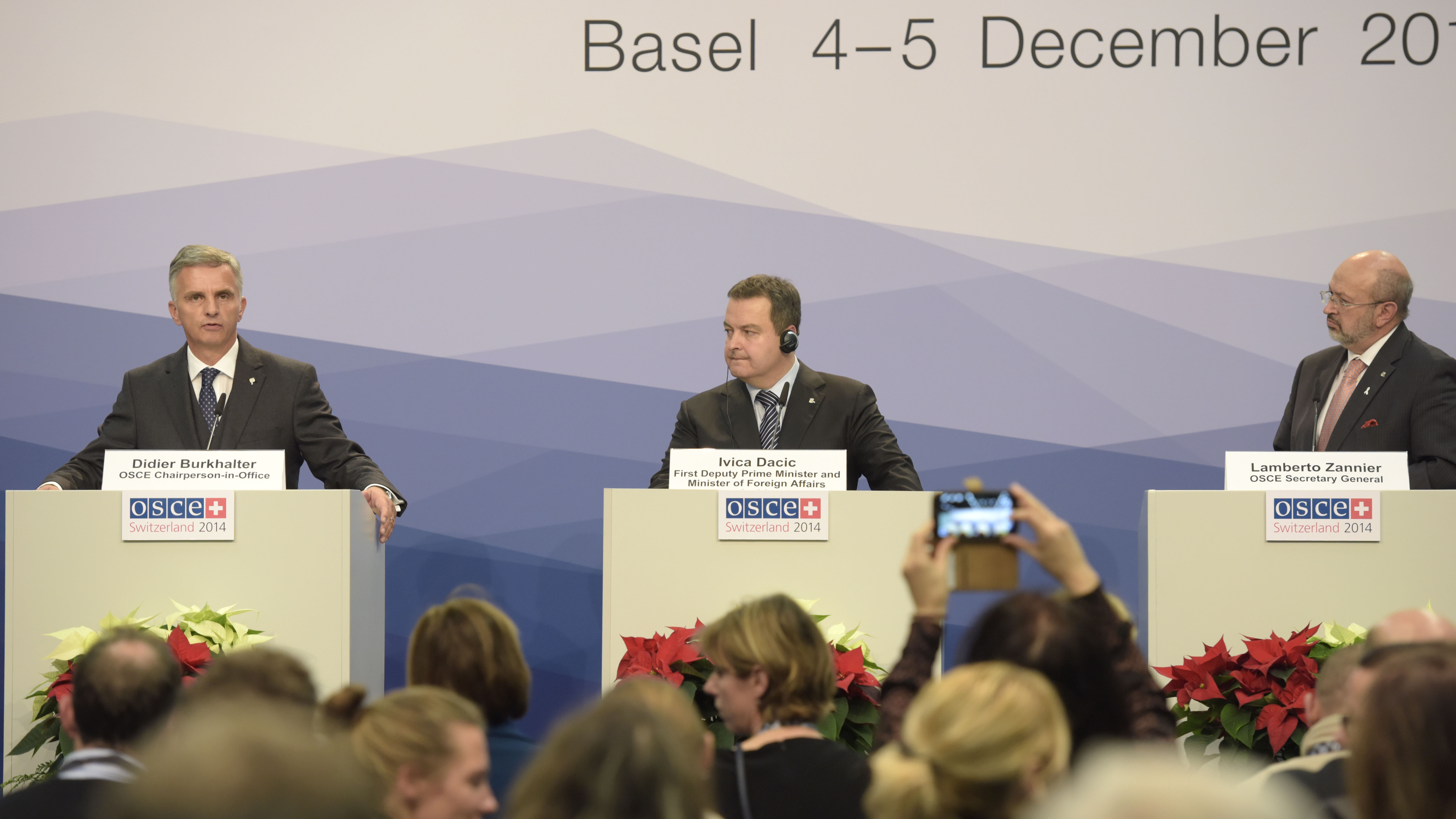 OSCE Chairperson, Swiss Foreign Minister Didier Burkhalter (l), during a press conference at the conclusion of the 2014 OSCE Ministerial Council in Basel, 5 December 2014.