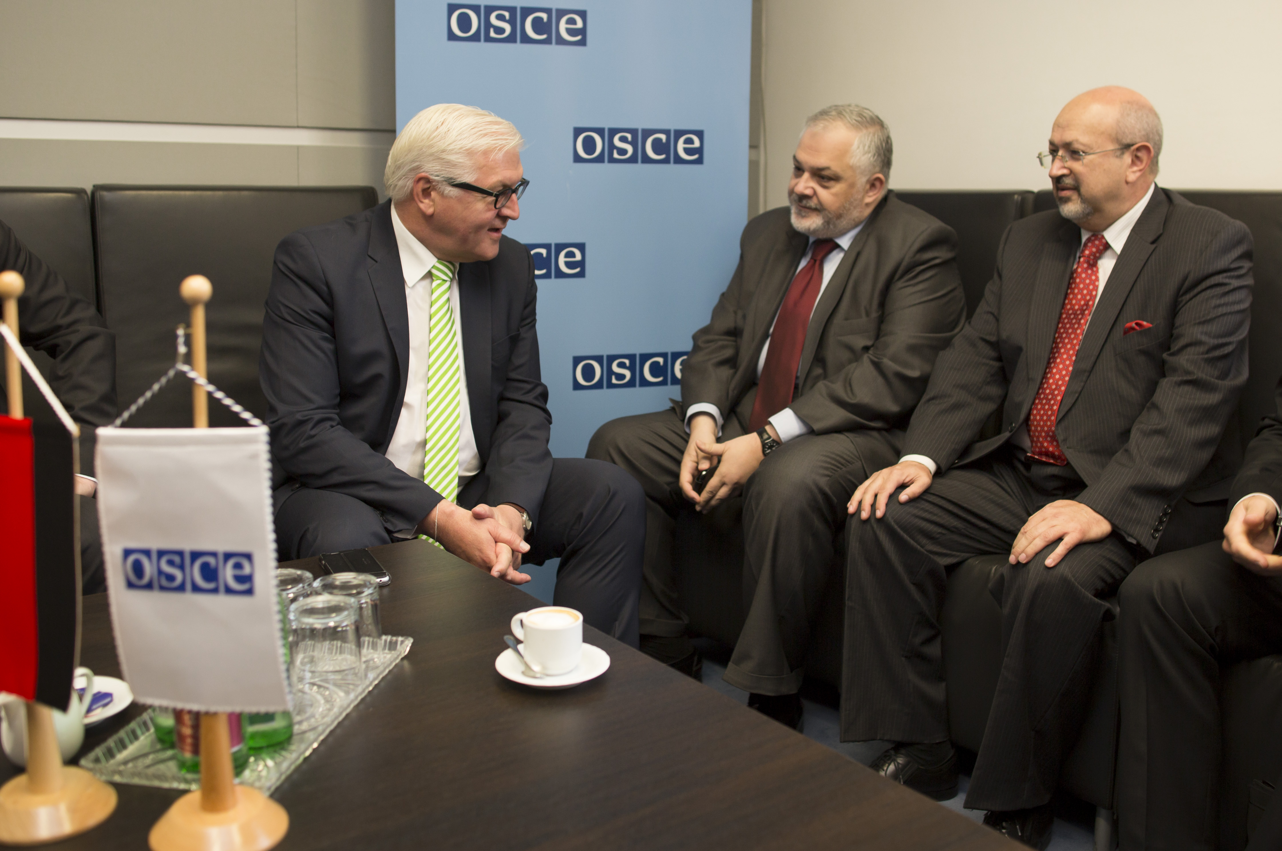 (L-r) German Foreign Minister Frank-Walter Steinmeier, Chair of the OSCE Permanent Council Vuk Žugić, and OSCE Secretary General Lamberto Zannier meeting in Vienna, 2 July 2015.