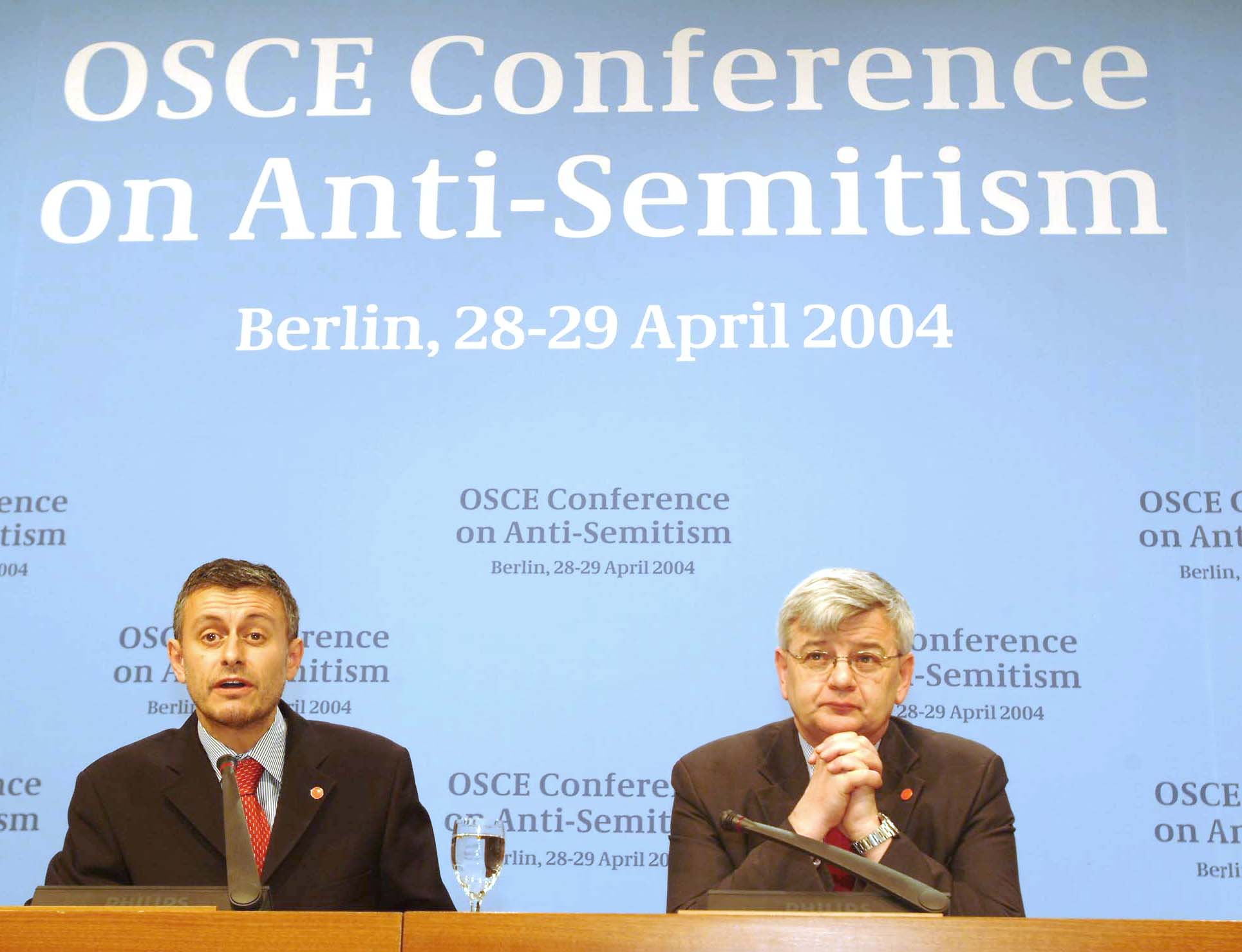 Chairman-in-Office Solomon Passy (left) and German Foreign Minister Joschka Fischer at a joint news conference at the end of the OSCE Conference on Anti-Semitism, in Berlin, 29 April 2004.