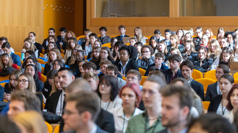 Student teams participating in the European Council Committee pose with placards reading countries, MUNLawS conference, the University of Ljubljana, Slovenia 11 November 2022.