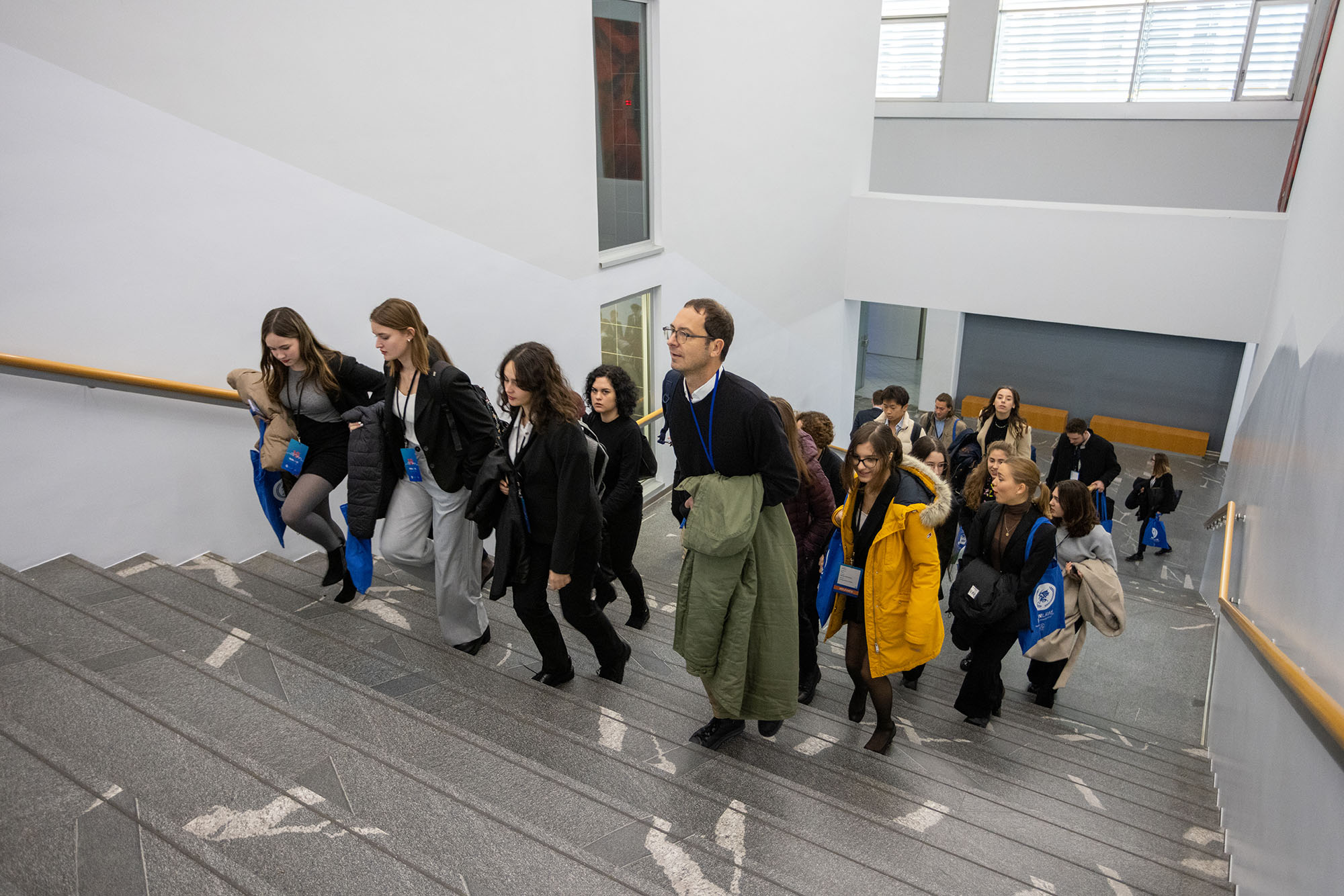 Participating students at the Faculty of Law walk up the stairs to attend the MUNLawS conference, hosting the OSCE Court of Conciliation and Arbitration’s Moot, at the University of Ljubljana, Slovenia 11 November 2022.