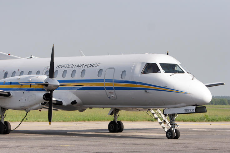 A Saab-340B aircraft on the tarmac during a joint US-Swedish training flight over Slovakia, 28 May 2008, under the Open Skies Treaty.
