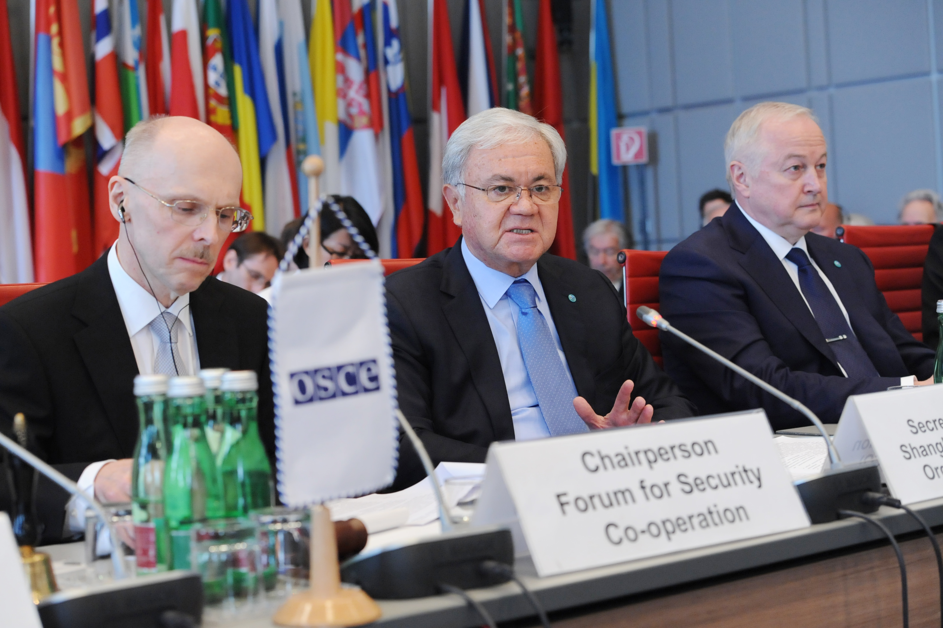 (l-r) Andrei Vorobiev, Chairperson of the Forum for Security Co-operation (FSC); Shanghai Co-operation Organization (SCO)'s Secretary General Rashid Alimov and Evgeny Sysoev, Director of the Executive Committee of SCO’s Regional Anti-Terrorist Structure in the FSC session on 10 May 2017, Vienna.