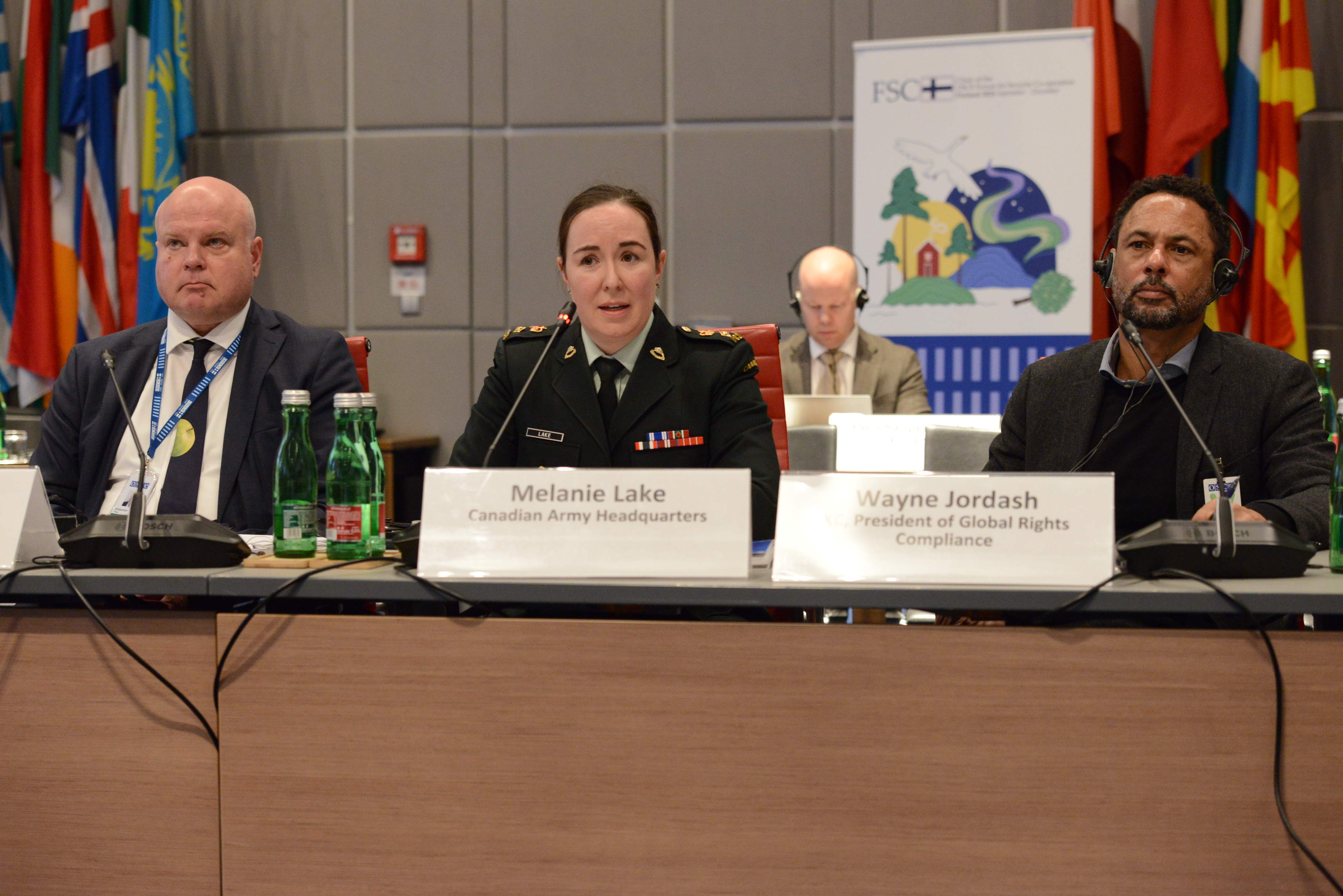 Chairperson Vesa Häkkinen, Ambassador and Permanent Representative of Finnland to the OSCE (left) with panelists at the Forum for Security Co-operation (FSC) side event on Sexual and Gender-Based Violence as a Weapon of War, Vienna, 13 November 2025.