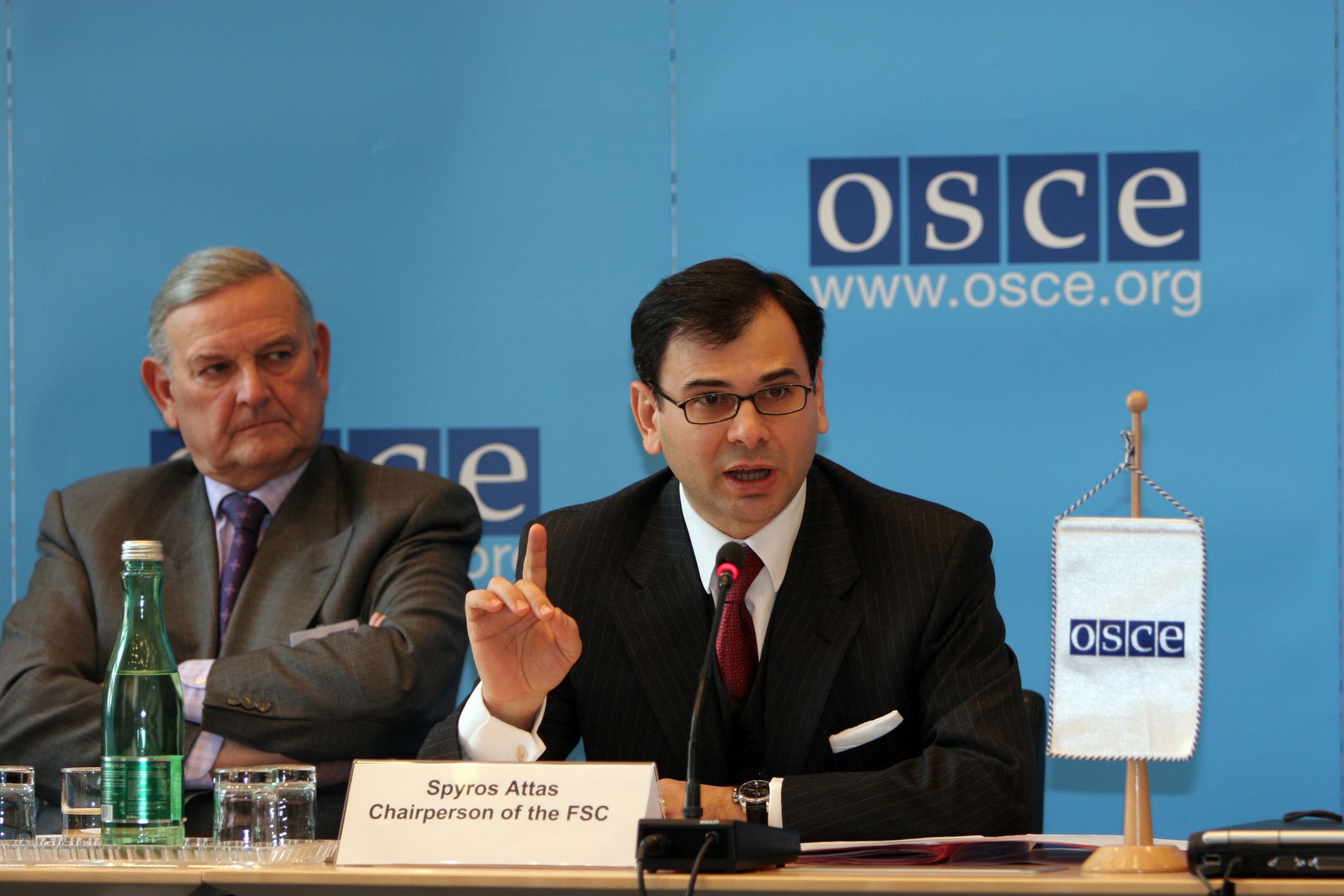 Cyprus FSC Chairman Spyros Attas (right) speaks at an OSCE news conference in Vienna, 21 March 2007. Francois-Xavier de Donnaa, Member of Belgian Parliament and former defence minister, looks on.
