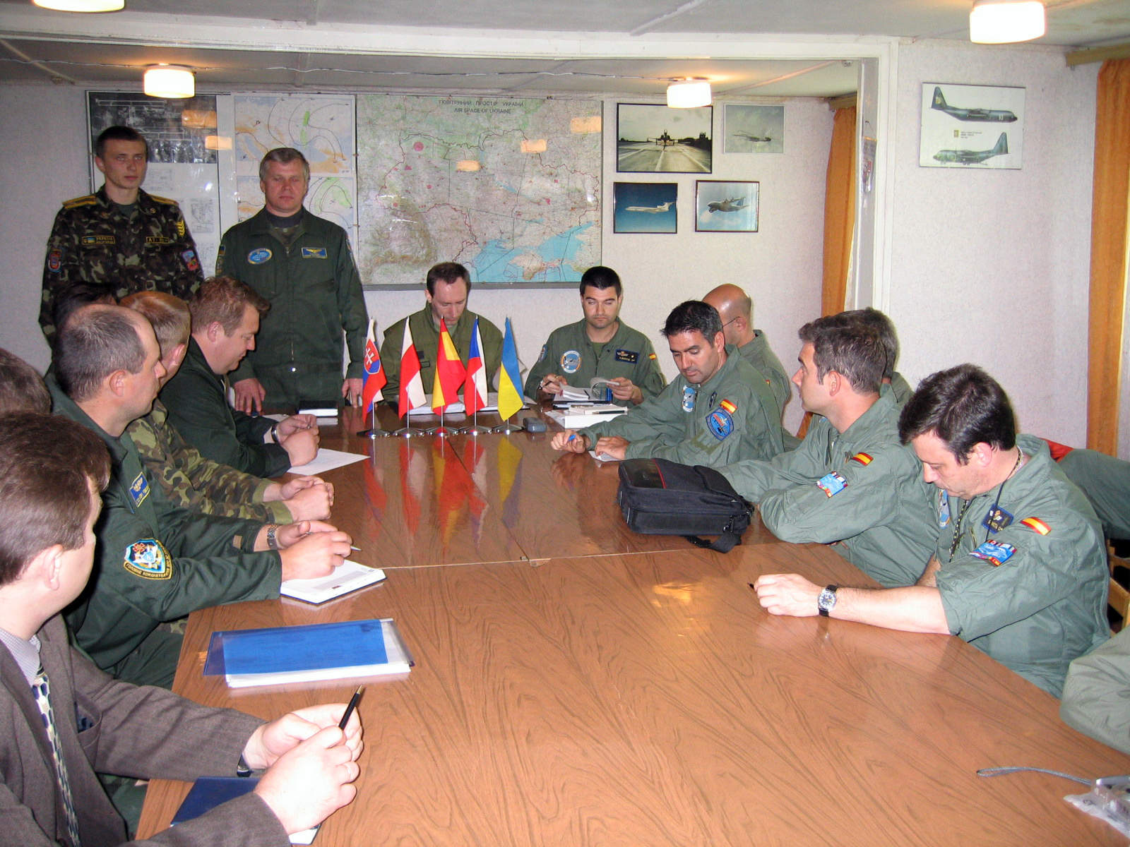 Czech and Spanish military experts discus a flight over Ukraine, May 2004, under the Open Skies Treaty, which establishes a regime of unarmed aerial observation flights over the entire territory of its 34 signatories.