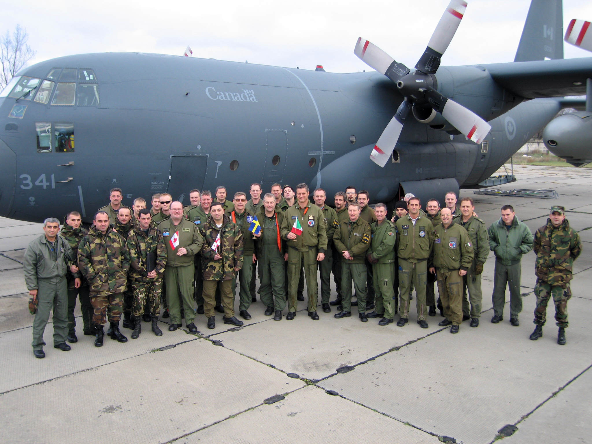 Members of a joint Canadian-Swedish-Italian flight over Georgia under the Open Skies Treaty pose, 30 November 2006, next to a Canadian C-130H aircraft.