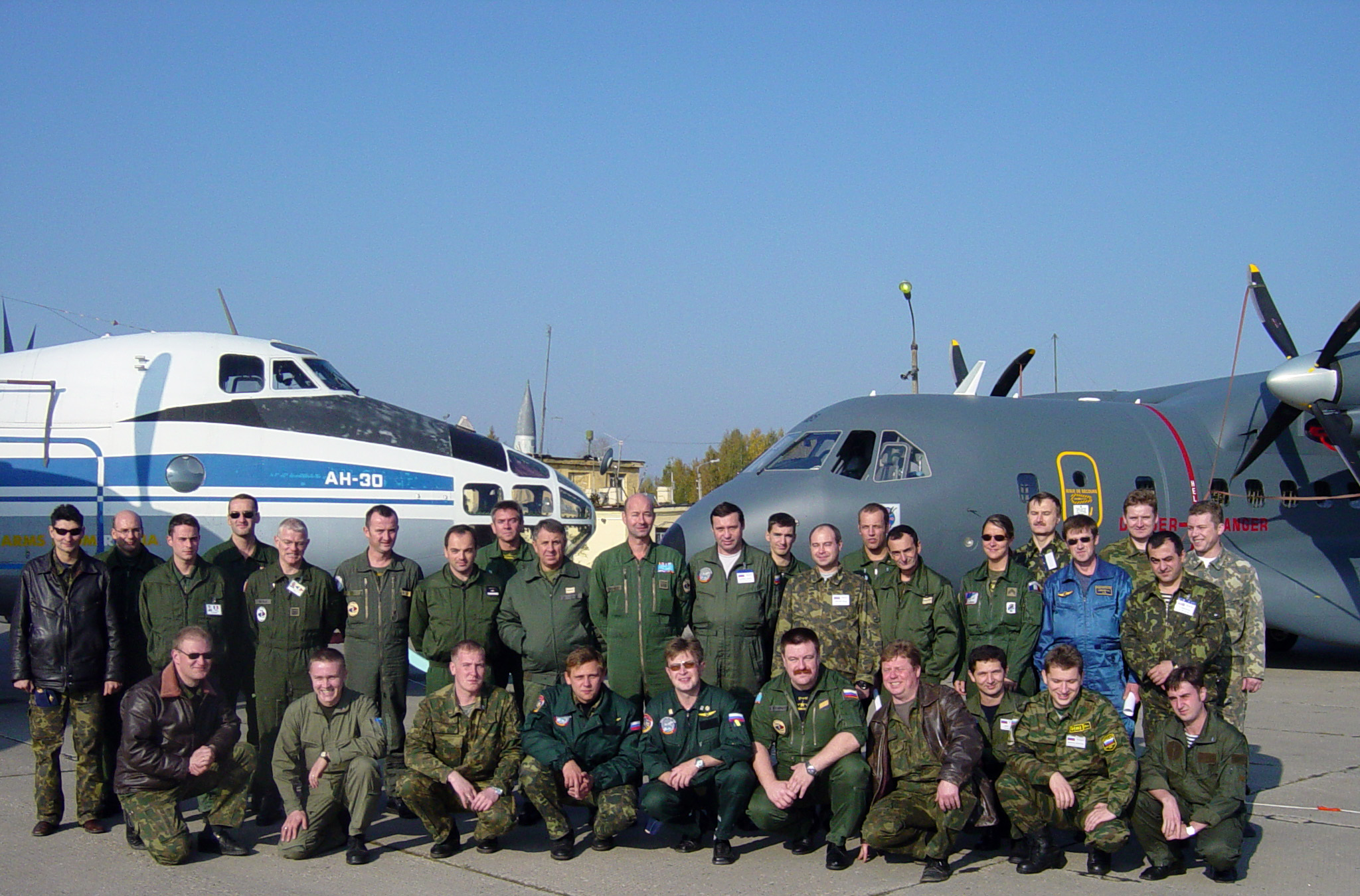 Russian and French crews flying under the Open Skies Treaty, pose on the tarmac next to their aircrafts, September 2003.