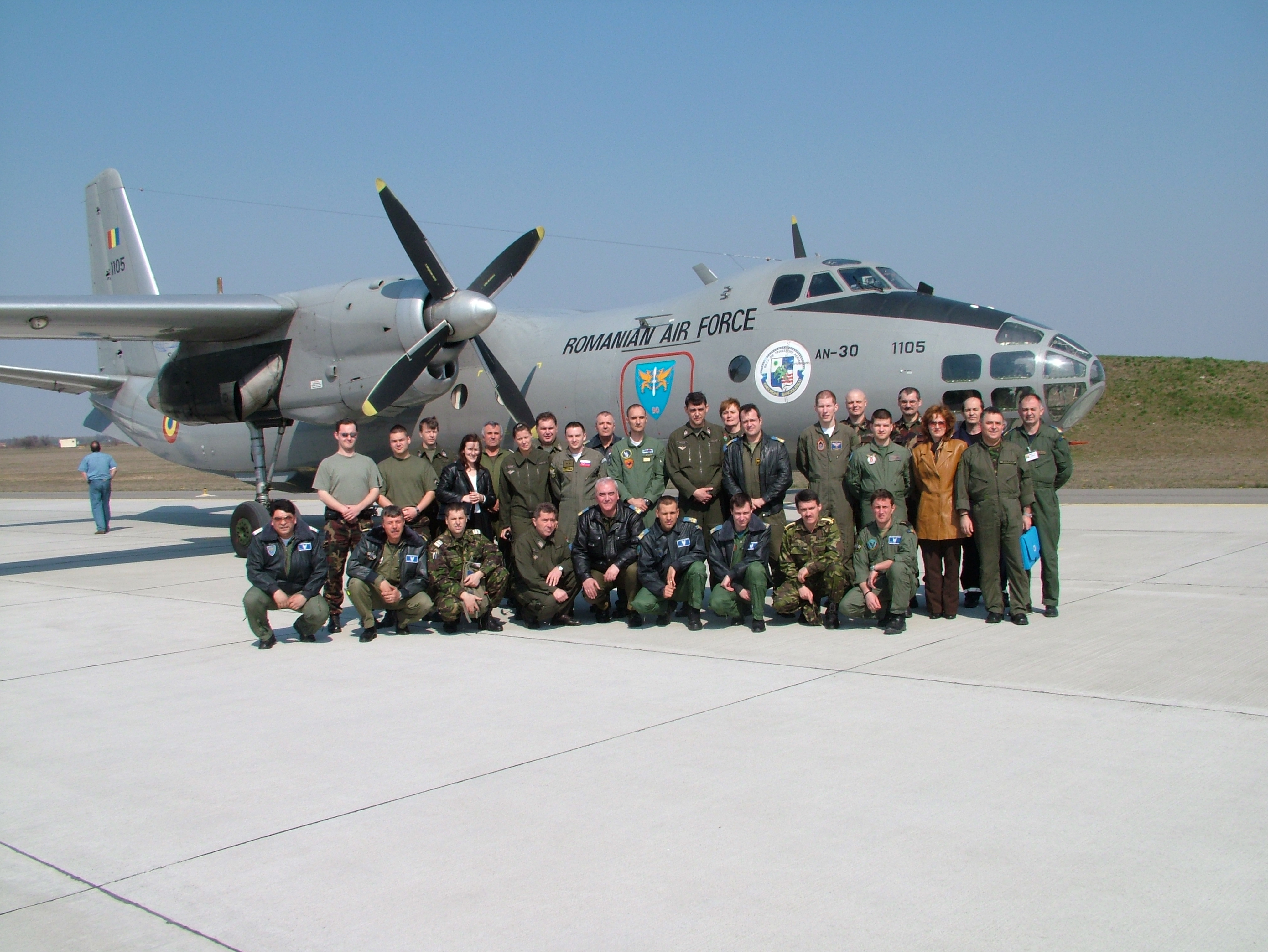 Members of a joint Romania-Hungary trial flight under the Open Skies Treaty pose in front of an AN-30B aircraft, 2 April 2007.