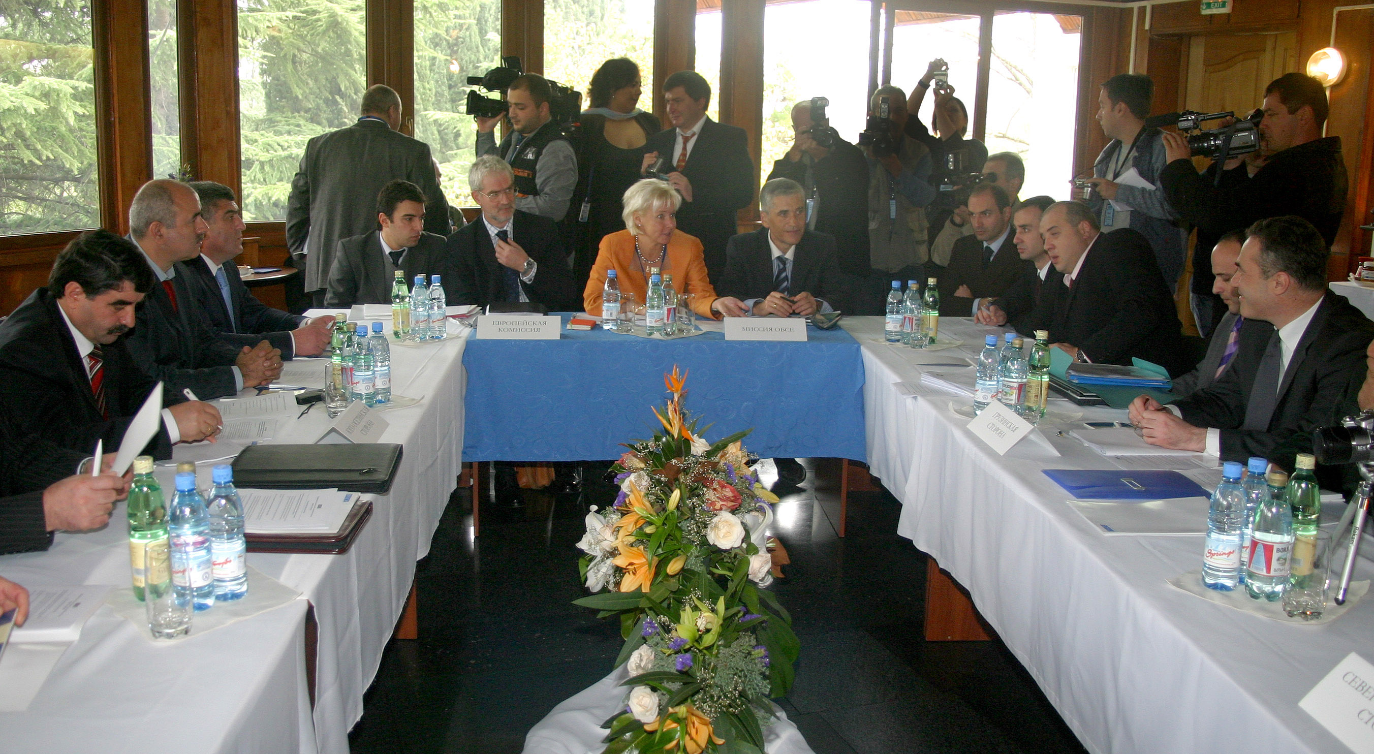 Ambassador Terhi Hakala (centre), Head of the OSCE Mission to Georgia, with representatives of the Georgian, South Ossetian, North Ossetian and Russian sides at a Joint Control Commission meeting, Tbilisi, 23 October 2007.