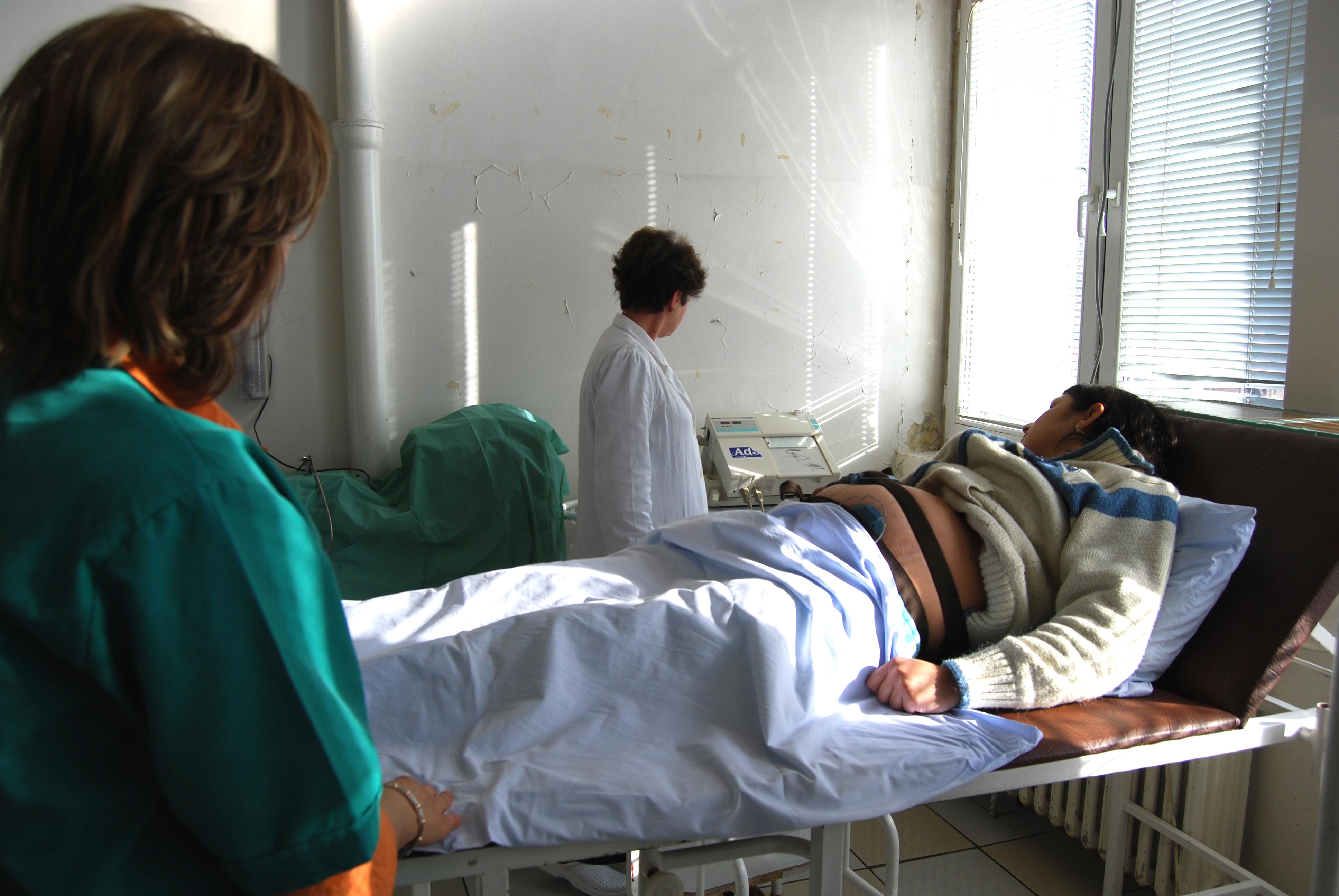 A doctor examines a pregnant woman and checks the baby's heartbeat at Rahovec/Orahovac health centre, Kosovo, 10 March 2009.