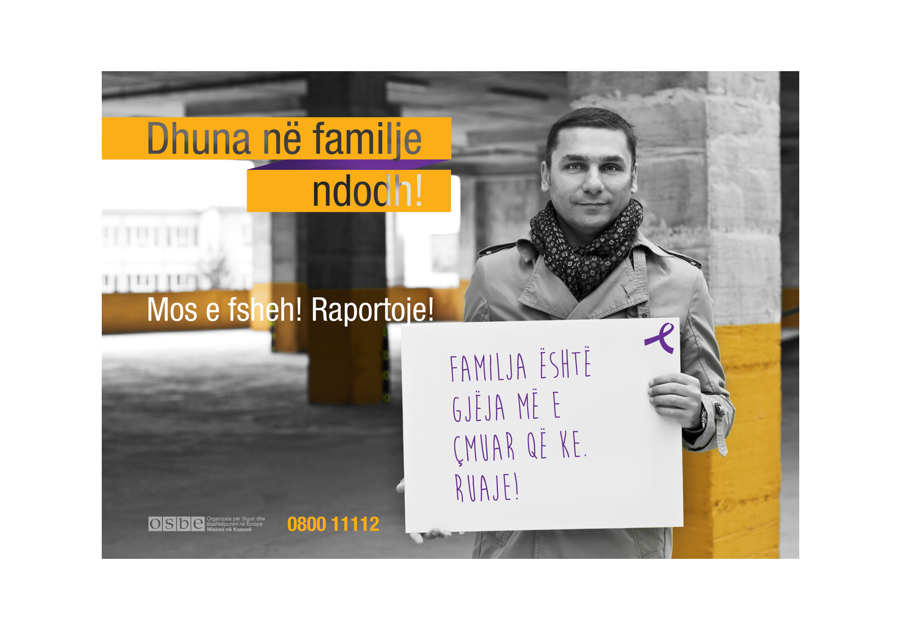 Adriatik Kelmendi, journalist and presenter, holds a sign in Albanian that says: "Family is the most precious thing you have. Treasure it!"