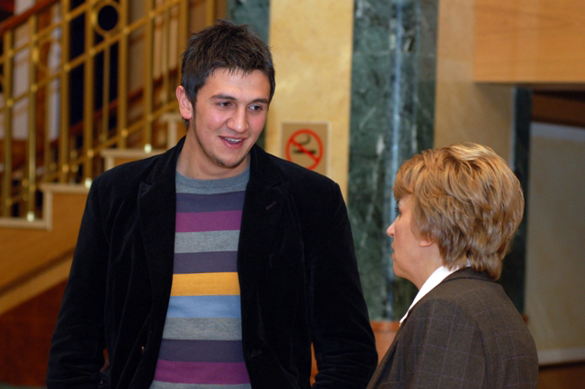 Kosovo Assembly member Gjylnaze Syla (right) talks to one of the students who have successfully finished a six-month internship in the Assembly of Kosovo, sponsored by the OSCE Mission, Pristina, 5 February 2007.