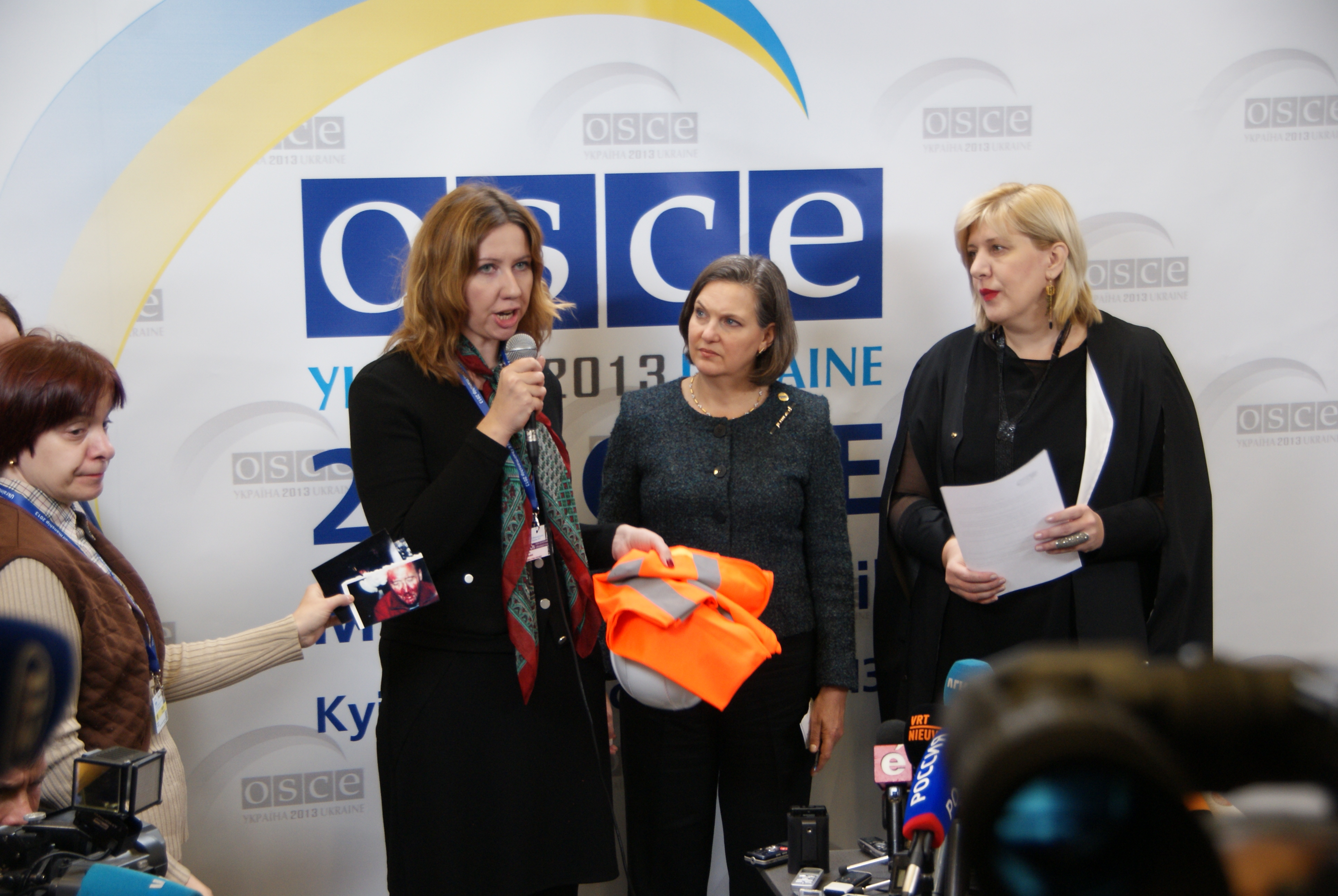 R-l: OSCE Representative on Freedom of the Media Dunja Mijatović, and Assistant Secretary of State for European and Eurasian Affairs of the United States Victoria Nuland, alongside Director of the Ukrainian Institute for Mass Information Oksana Romanyuk at the OSCE Ministerial Council in Kyiv, 5 December 2013.