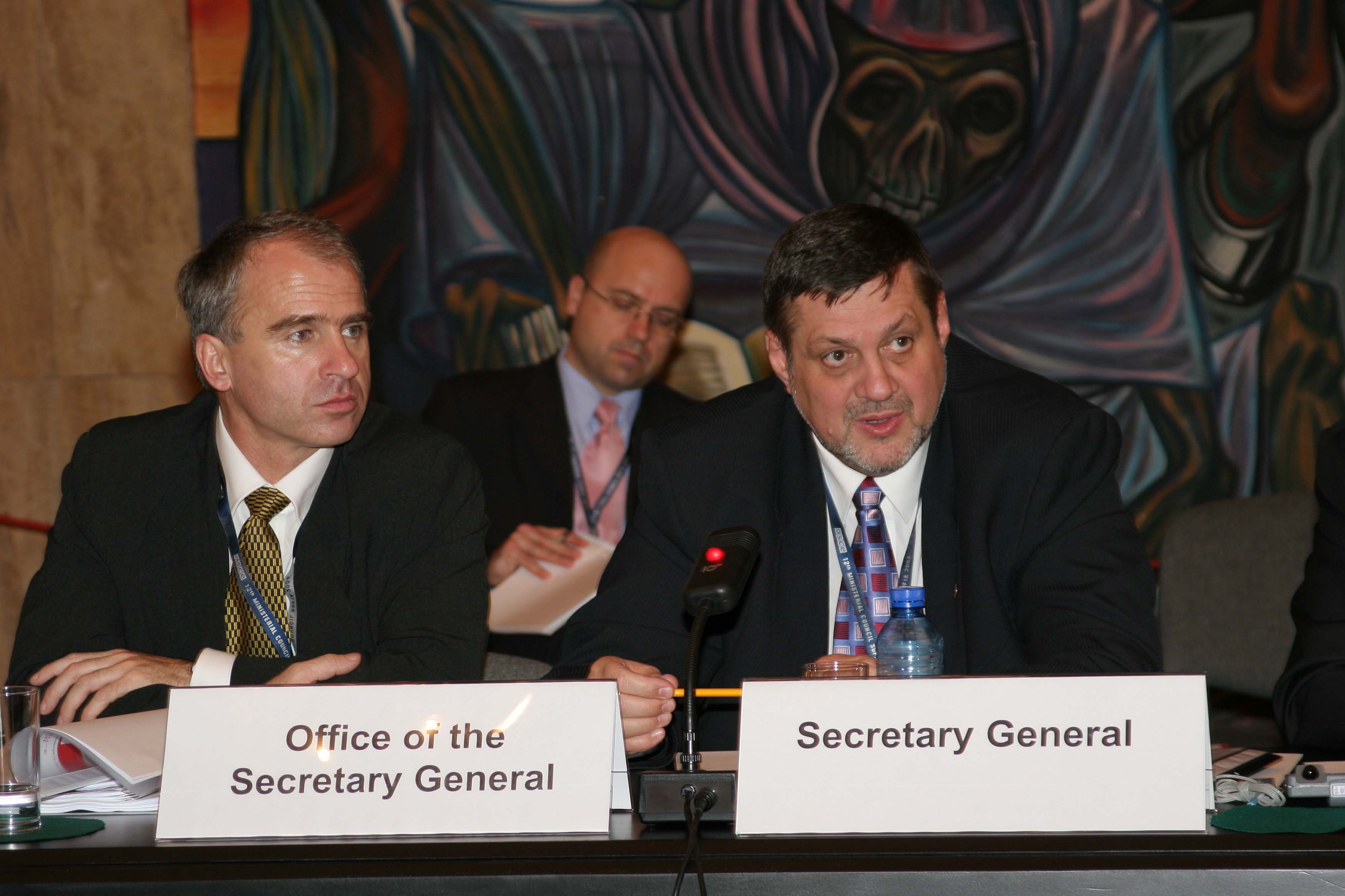 OSCE Secretary General Jan Kubis speaks at the OSCE Ministerial Council in Sofia. To the left is Didier Fau, Director of the Office of the Secretary General, 5 December 2004.
