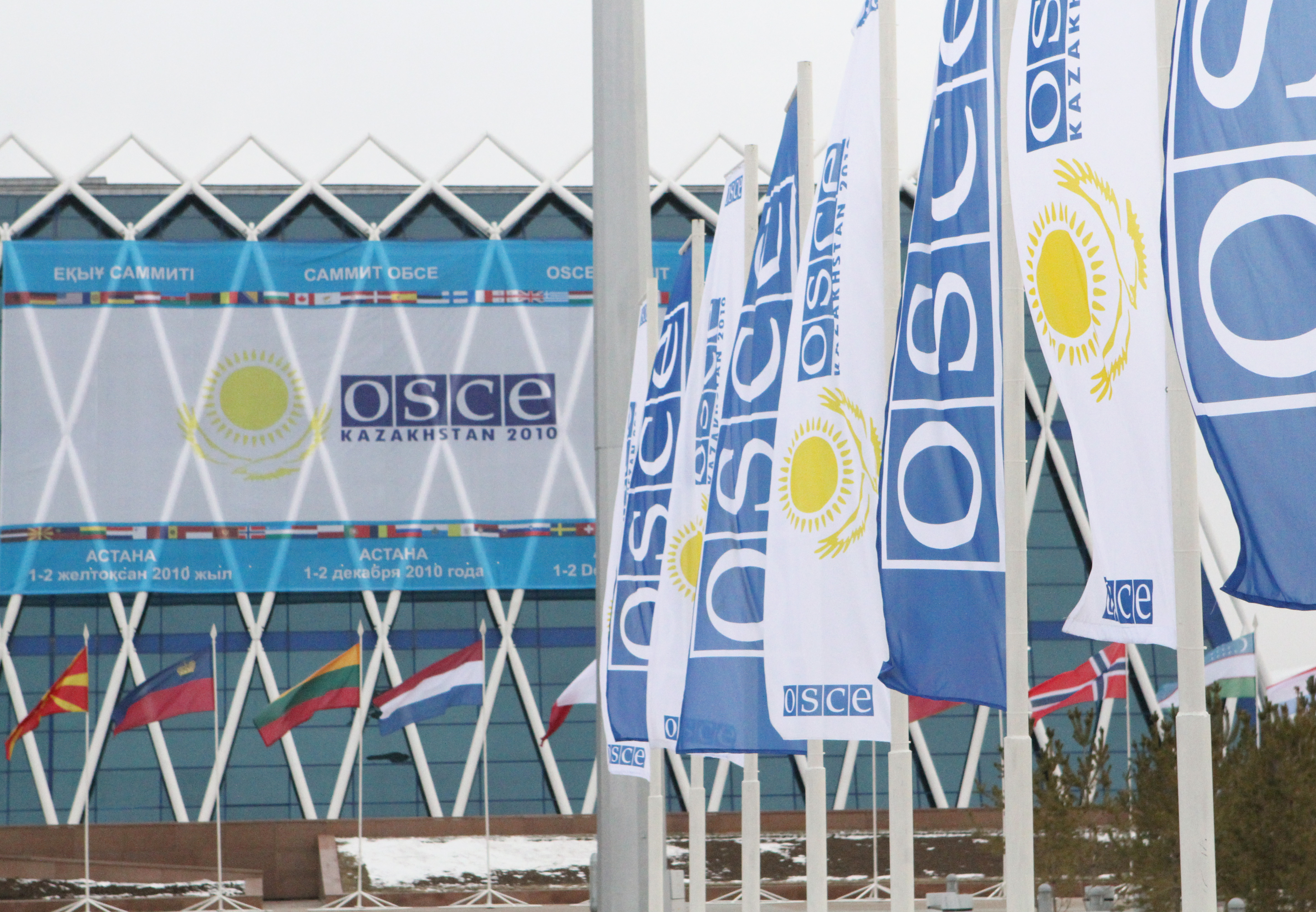 OSCE flags outside the Palace of Independence, the venue for the 2010 OSCE Summit in Astana, 26 November 2010.