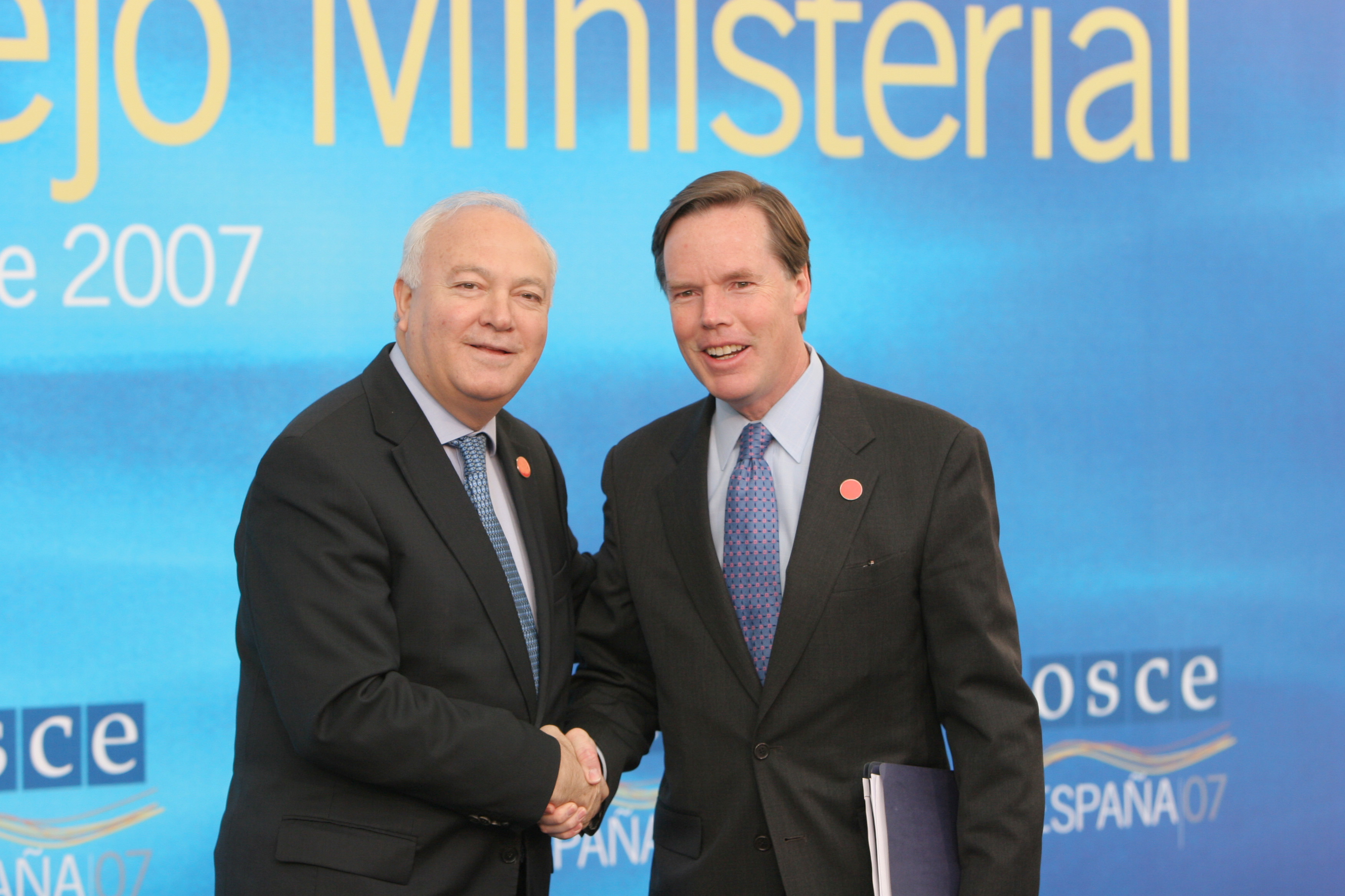 OSCE Chairman-in-Office, Spanish Foreign Minister Miguel Angel Moratinos (left), welcomes U.S. Under-Secretary of State for Political Affairs Nicholas Burns at the 15th OSCE Ministerial Council in Madrid, 29 November 2007.