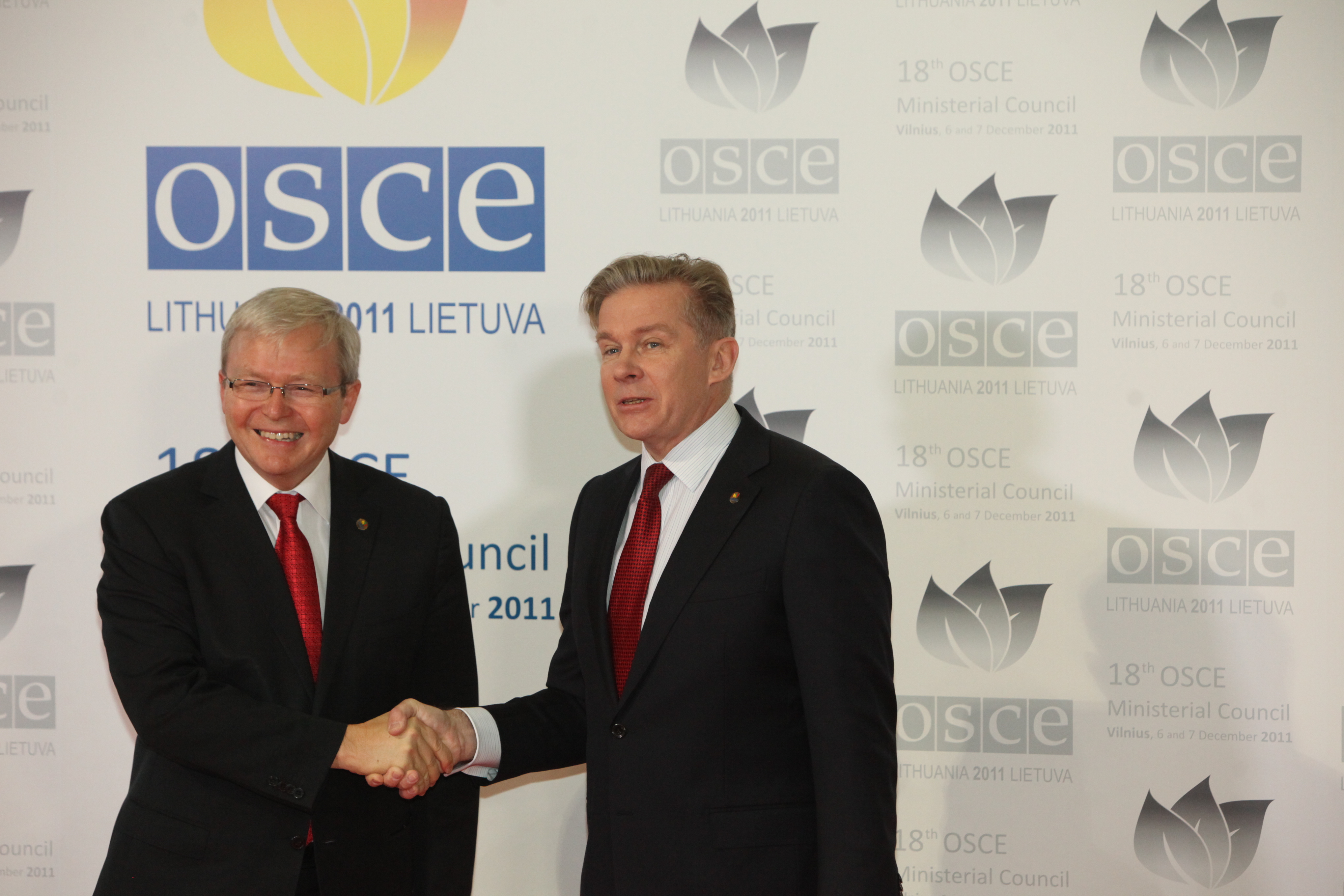 The OSCE Chairperson-in-Office, Lithuanian Foreign Minister Audronius Ažubalis, greets Kevin Rudd, Minister for Foreign Affairs of Australia, at the 18th OSCE Ministerial Council, Vilnius, 6 December 2011.