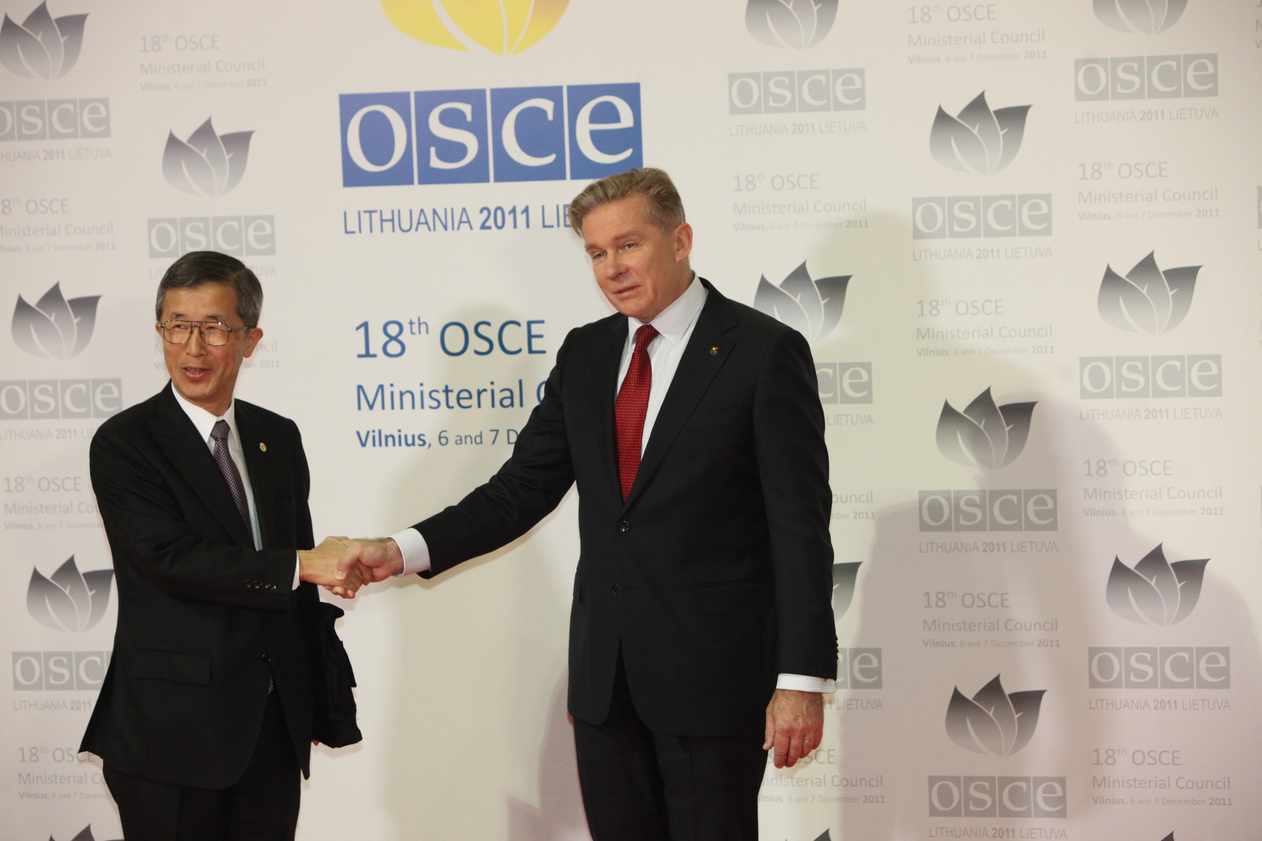 The OSCE Chairperson-in-Office, Lithuanian Foreign Minister Audronius Ažubalis, greets Yutaka Iimura, Special Representative of the Government of Japan for the Middle East and Europe, at the 18th OSCE Ministerial Council, Vilnius, 6 December 2011.
