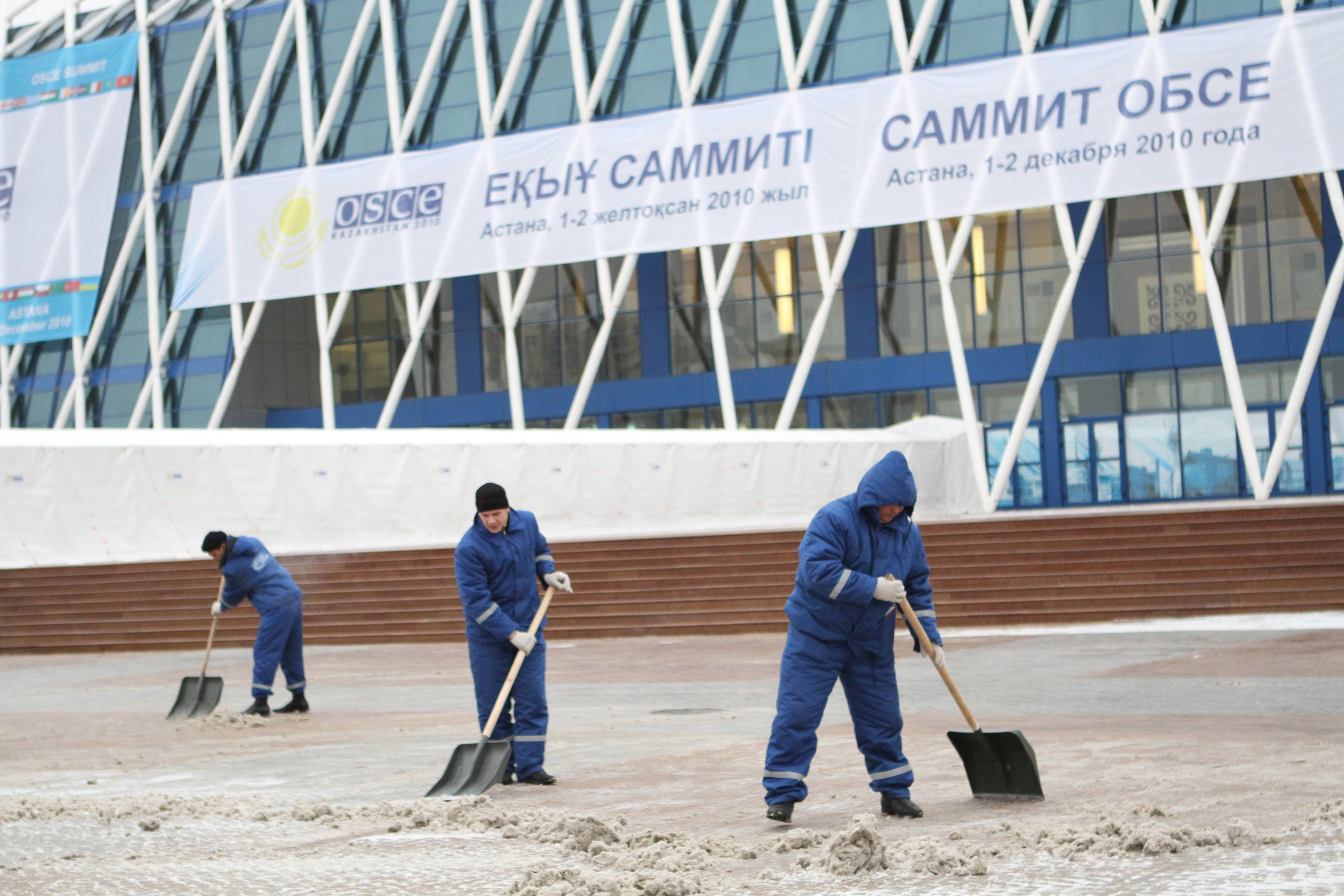 Arbeiter beim Schneeräumen vor dem Palast der Unabhängigkeit, Astana, 28. November 2010.