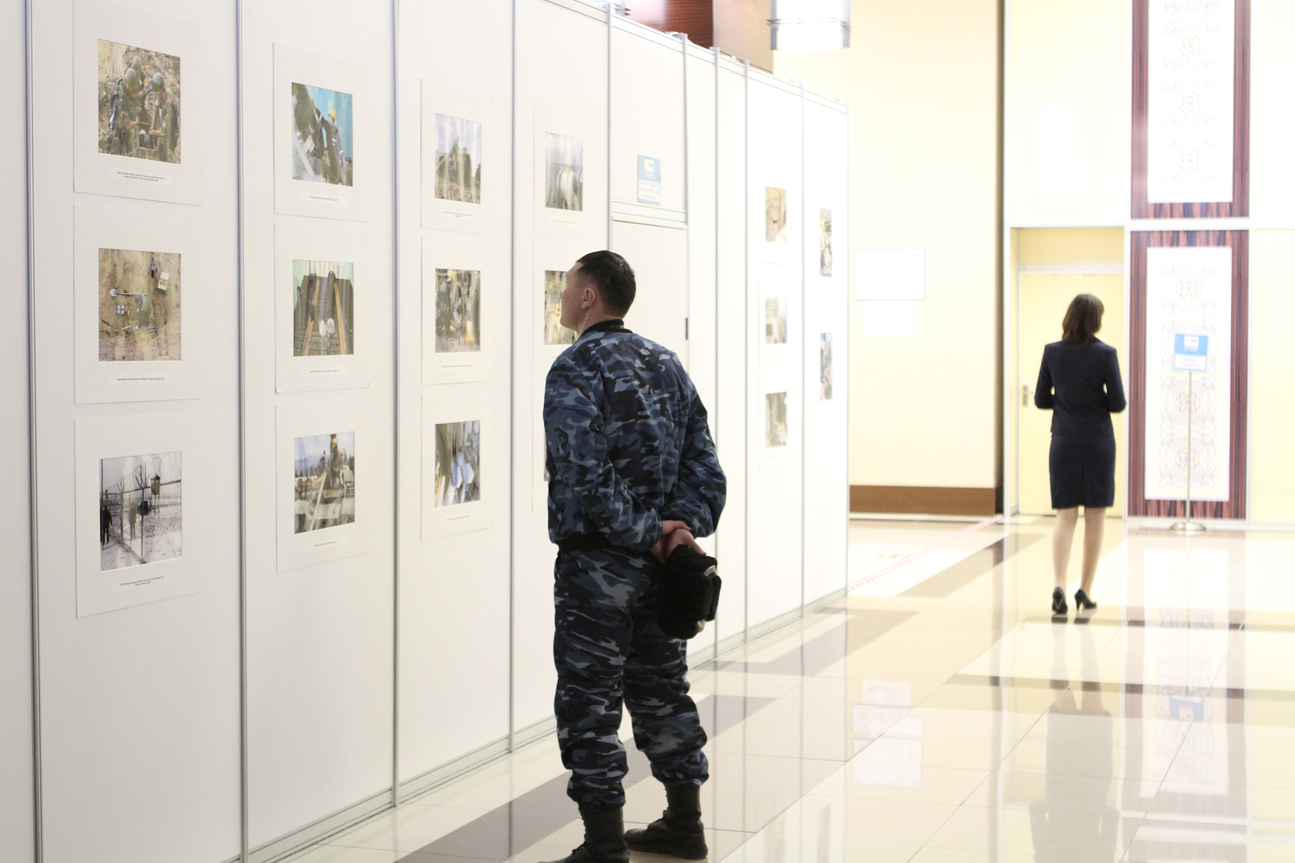 Ein Mitglied des Sicherheitsteams beim Betrachten einer Fotogalerie, Astana, 28. November 2010.