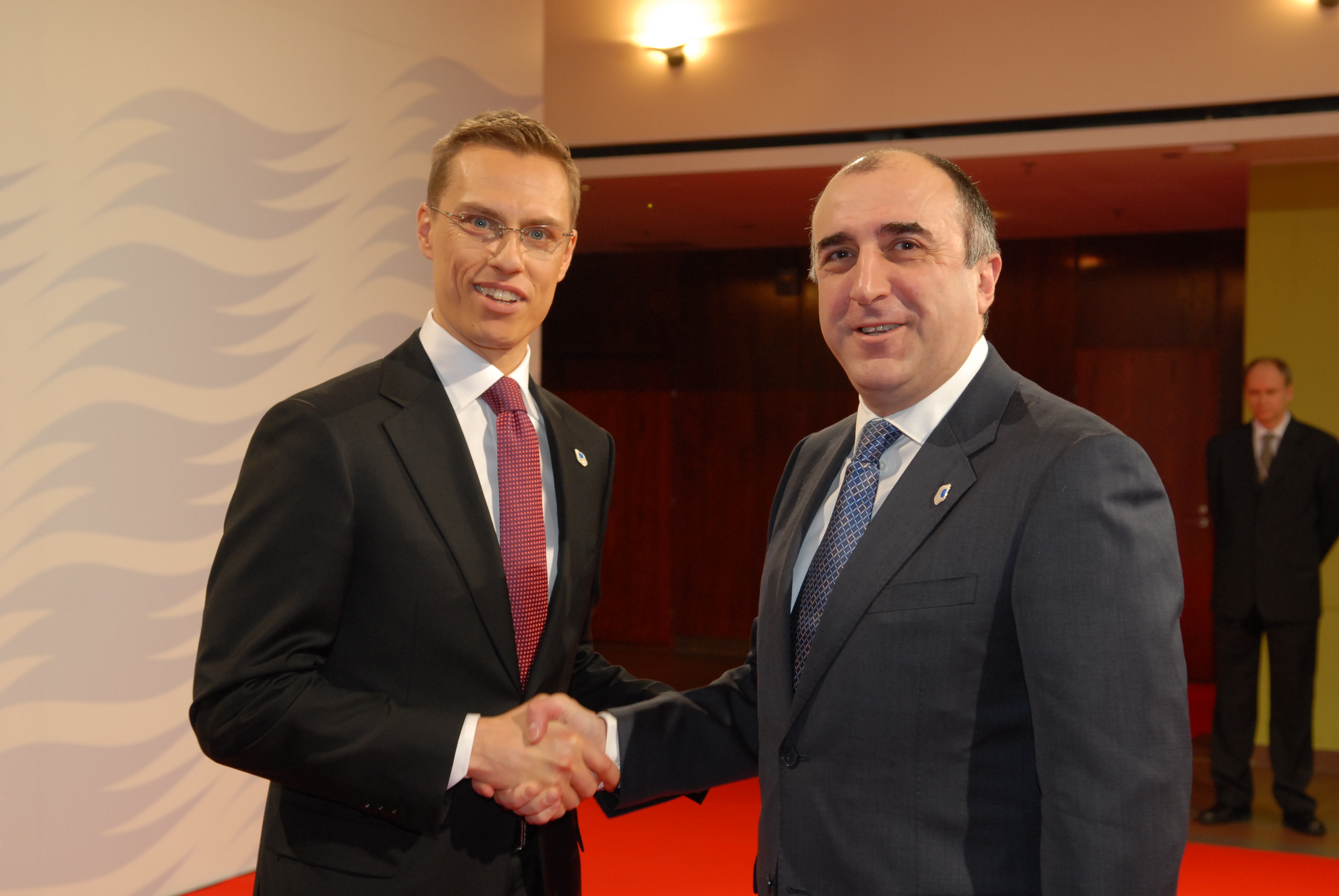 OSCE Chairman-in-Office, Finnish Foreign Minister Alexander Stubb (left), welcomes Elmar Mammadyarov, Minister of Foreign Affairs of Azerbaijan, at the 16th OSCE Ministerial Council in Helsinki, 4 December 2008.