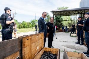 Zamjenica šefice Misije OEBS-a u Crnoj Gori Siv-Katrine Leirtroe i projektni savjetnik u Misiji Johan Dahl prisustvuju uništavanju oružja u organizaciji Ministarstva unutrašnjih poslova Crne Gore sa UNDP/SEESAC u Nikšiću, Crna Gora, 7. jun 2023. godine.