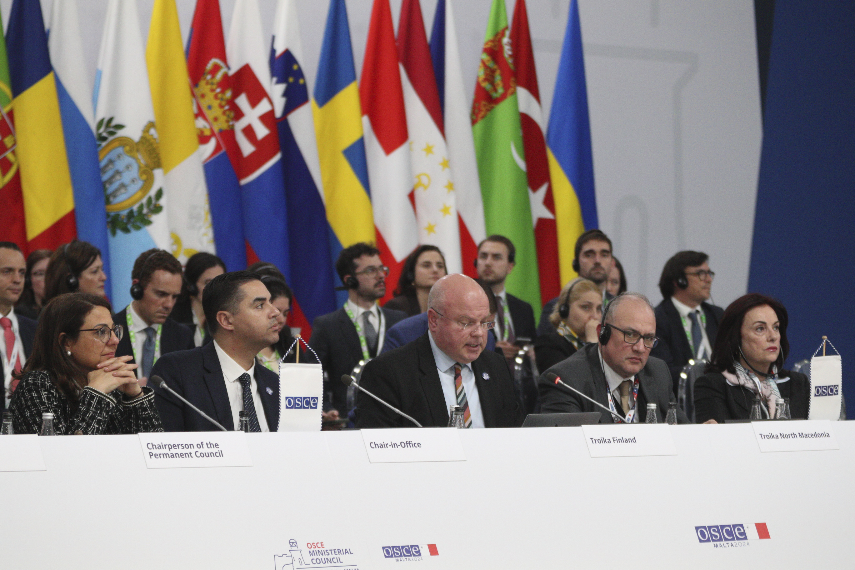 The OSCE Troika of 2024 (from left to right): Chairperson of the OSCE Permanent Council Ambassador Nastasha Meli, Minister of Foreign Affairs of Malta and OSCE Chairperson-in-Office Ian Borg, Ambassador Vesa Häkkinen, Permanent Mission of Finland to the OSCE representing the incoming Chair; and Ambassador Pajo Avirovikj, Permanent Delegation of North Macedonia to the OSCE representing the outgoing Chair.