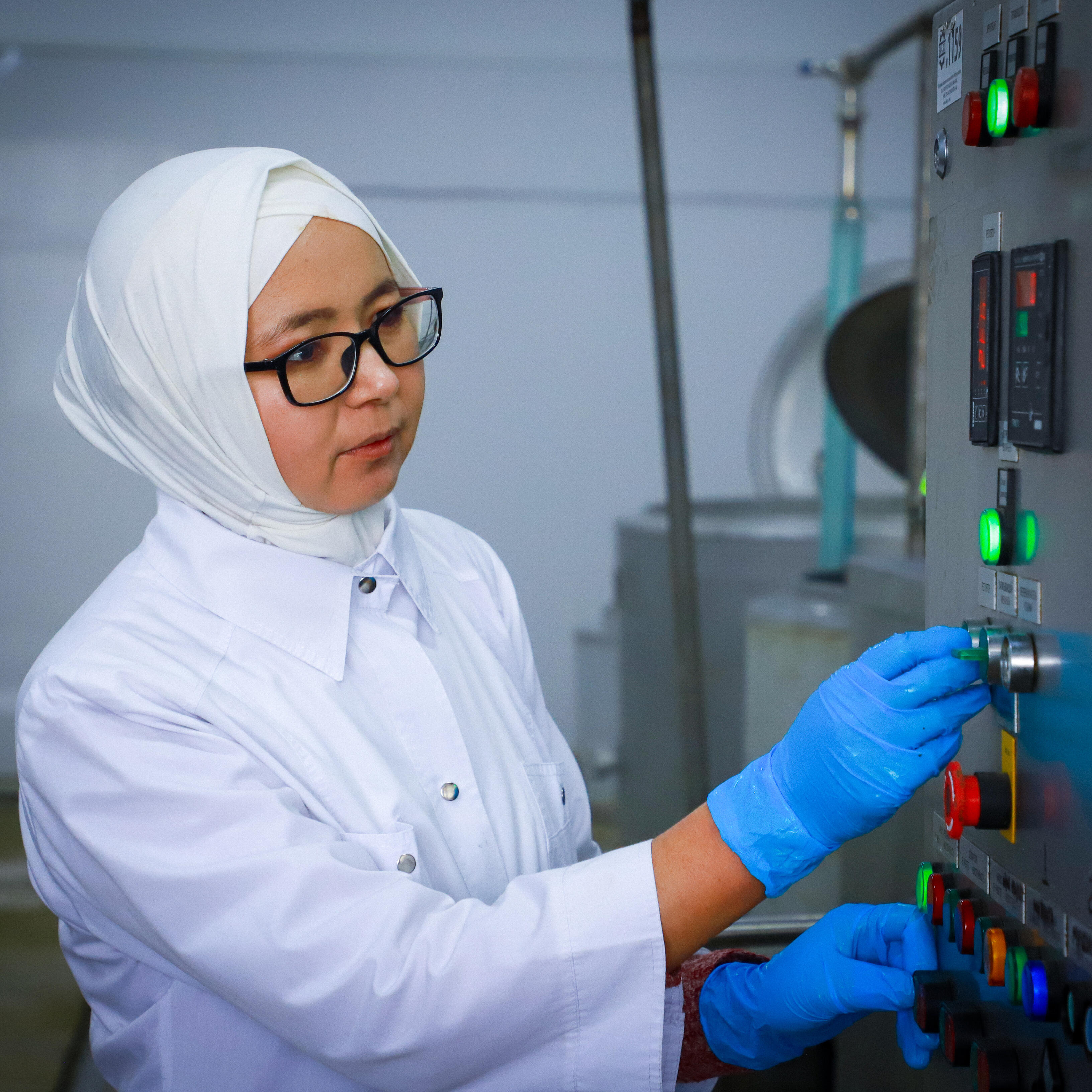 Bermet Musaeva operating equipment at a dairy workshop supported by the OSCE, Talas region, 20 November 2023.