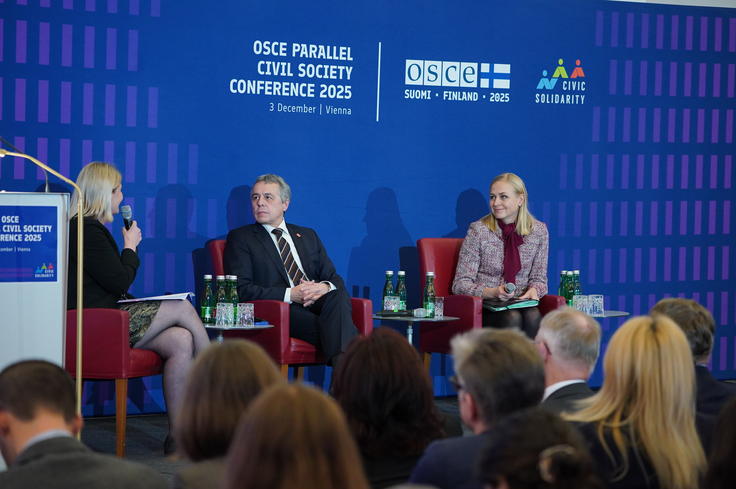 Federal Councillor and Head of the Federal Department of Foreign Affairs of Switzerland Ignazio Cassis and Chairperson-in-Office of the OSCE and Foreign Minister of Finland Elina Valtonen at Civil Society Parallel Conference, Vienna, 3 December 2025
