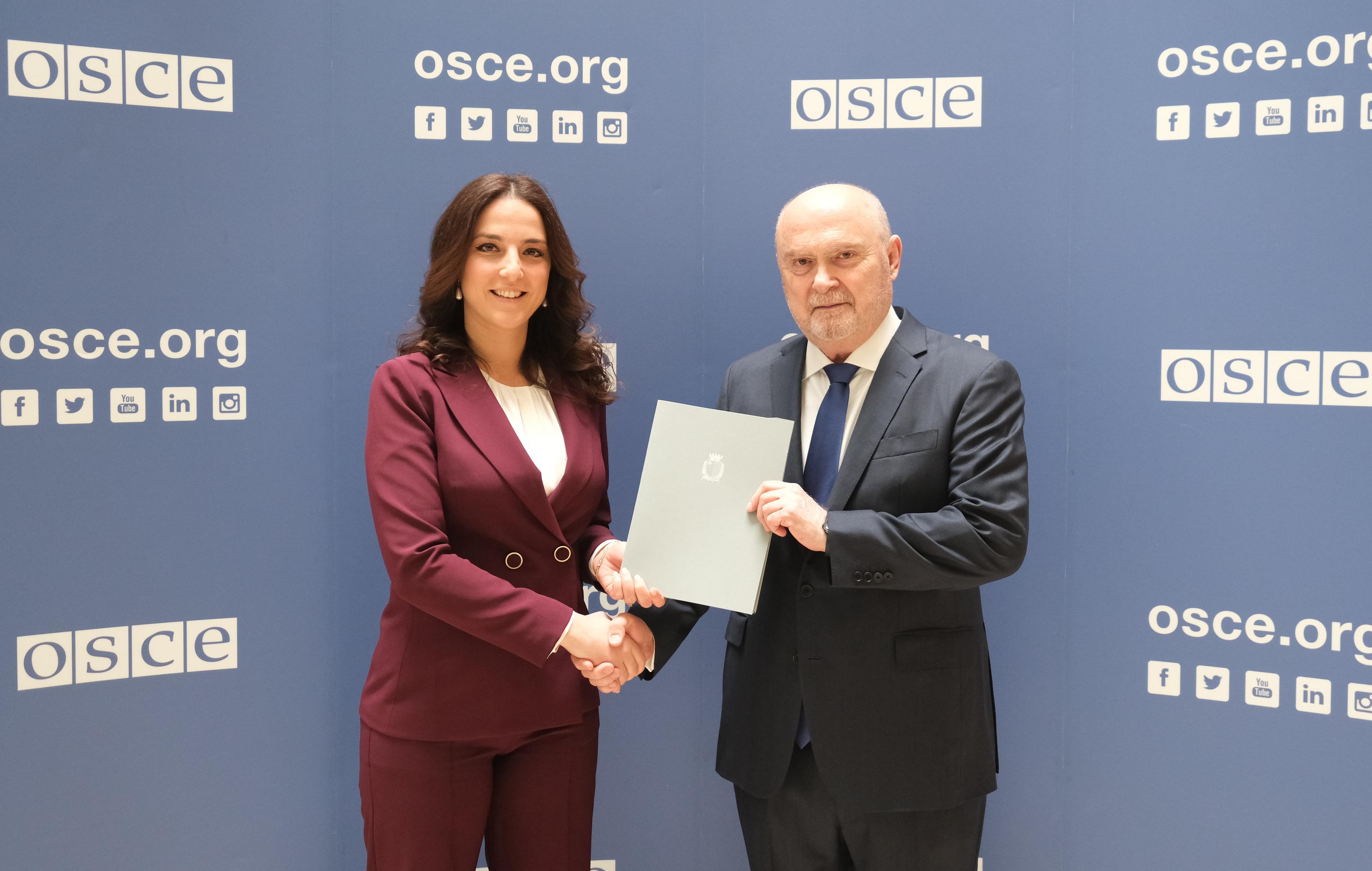 H.E. Francesca Camilleri Vettiger, Ambassador and Permanent Representative of the Republic of Malta to the OSCE, with the OSCE Secretary General Feridun H. Sinirlioğlu, Vienna, 17 February 2026.