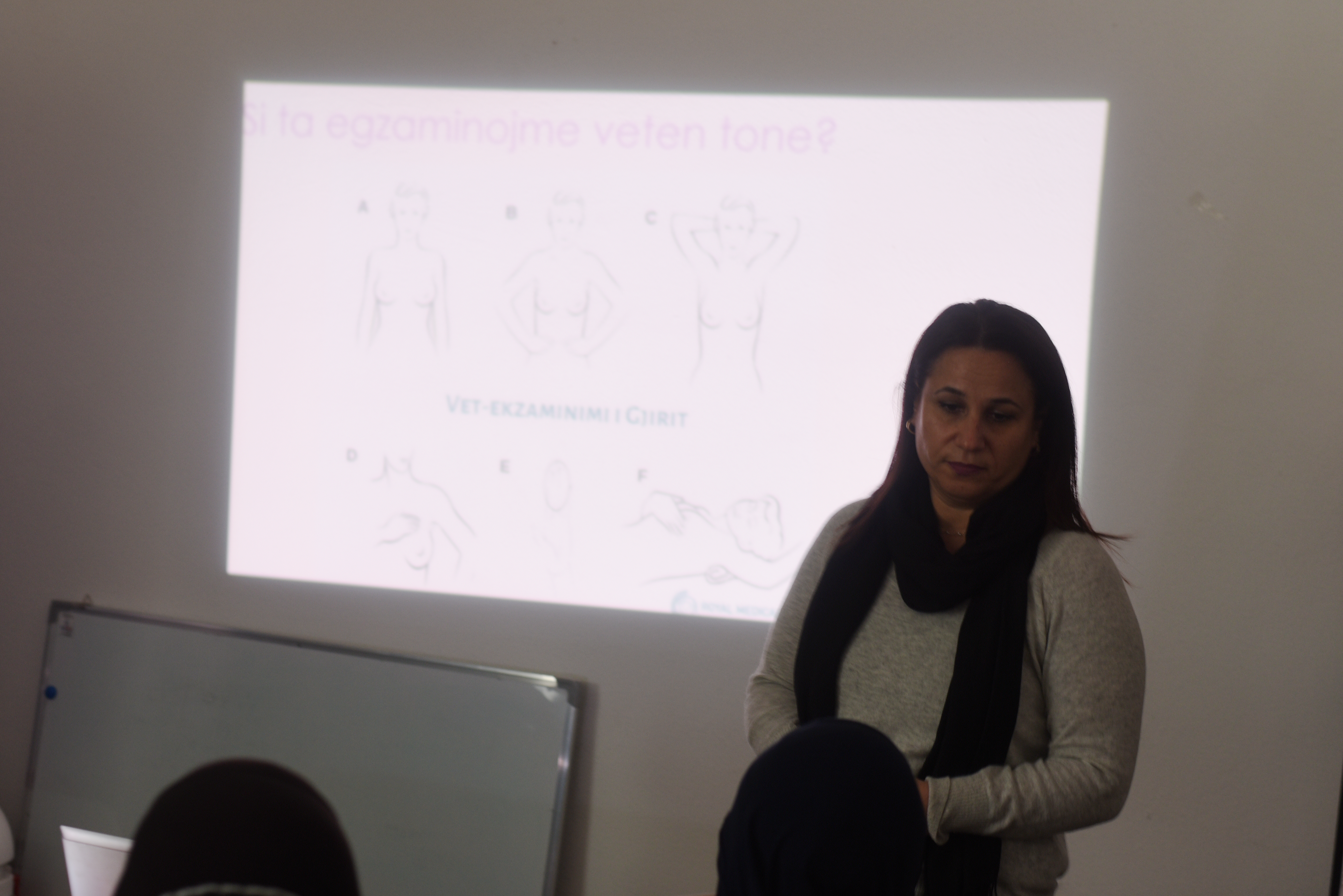 Dr. Flutra Ismajli Qosja presents self-examination techniques to prevent breast cancer at the session in Fushë Kosovë/Kosovo Polje, 22 November 2022.