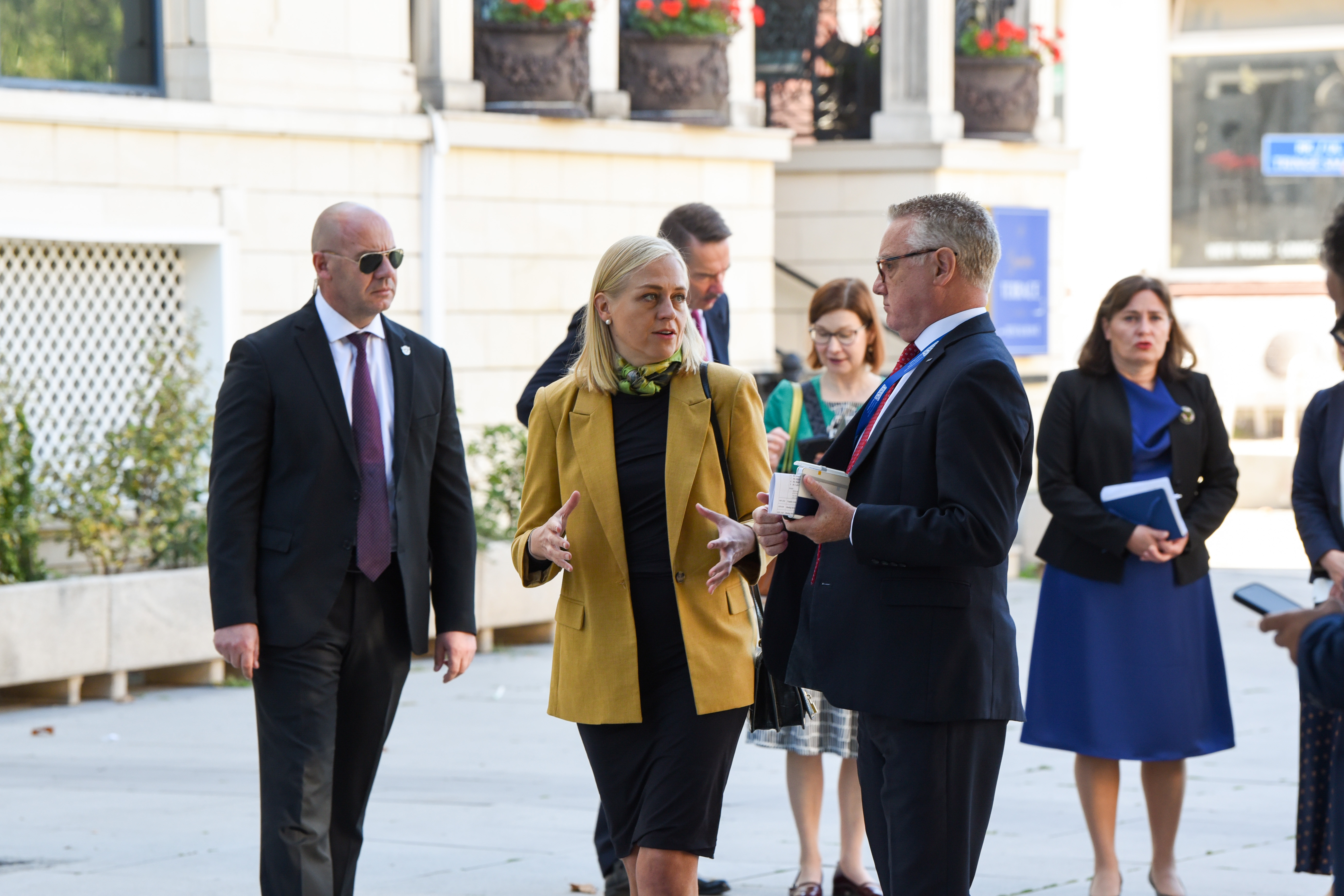 OSCE Chairperson-in-Office Finnish Foreign Minister Elina Valtonen, speaks with the Head of the OSCE Mission in Kosovo, Ambassador Gerard McGurk, during her visit to Prishtinë/Priština, 16 September 2025.