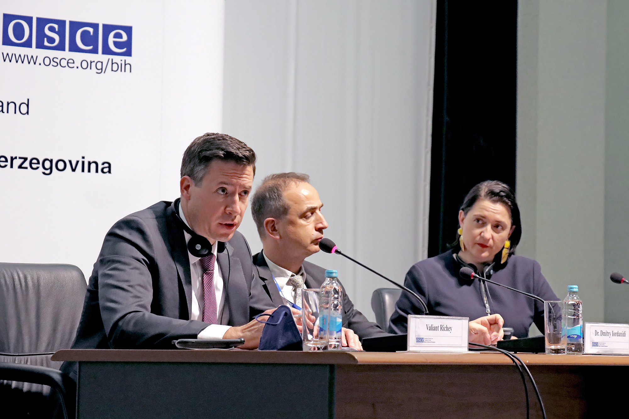 (L-r) Valiant Richey, OSCE Special Representative and Co-ordinator for Combating Trafficking in Human Beings, Dmitry Iordanidi, Deputy Head of the OSCE Mission to Bosnia and Herzegovina and Gudrun Kugler, Vice-Chair of the OSCE Parliamentary Assembly Ad Hoc Committee on Migration addressing media at a press conference in Sarajevo, 14 July 2021